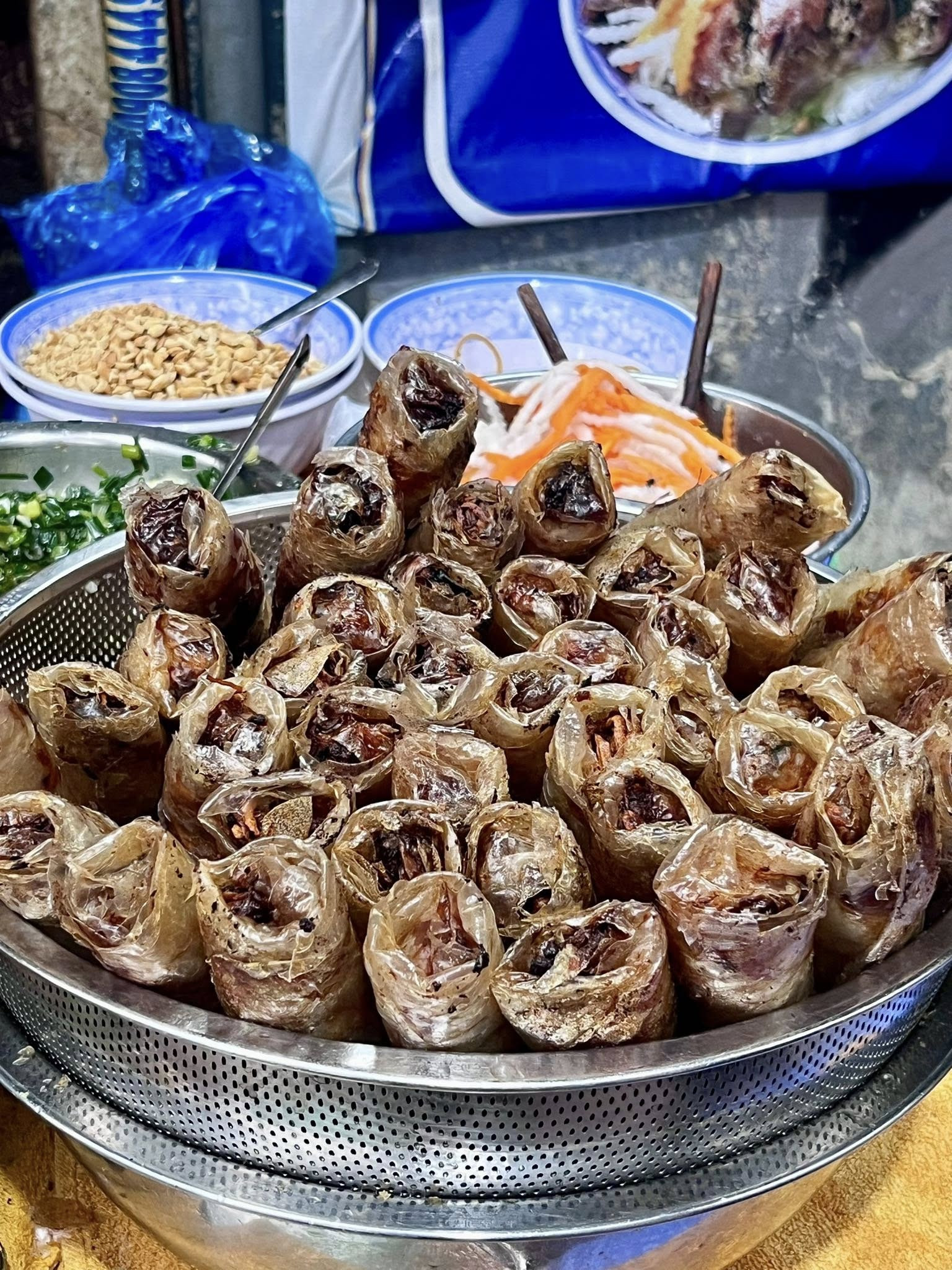 Chả giò cũng là điểm nhấn cho món bún thịt nướng của quán với lớp vỏ giòn rụm và phần nhân có vị đậm đà, béo ngậy từ thịt cua, khoai môn…