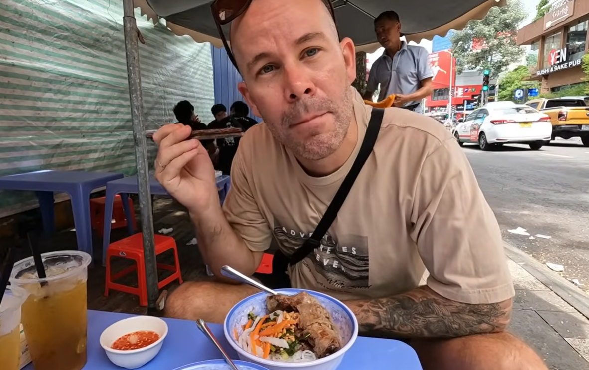 Nam du khách người Anh khen món bún thịt nướng rất ngon và thích cả không khí ăn uống vỉa hè thoải mái