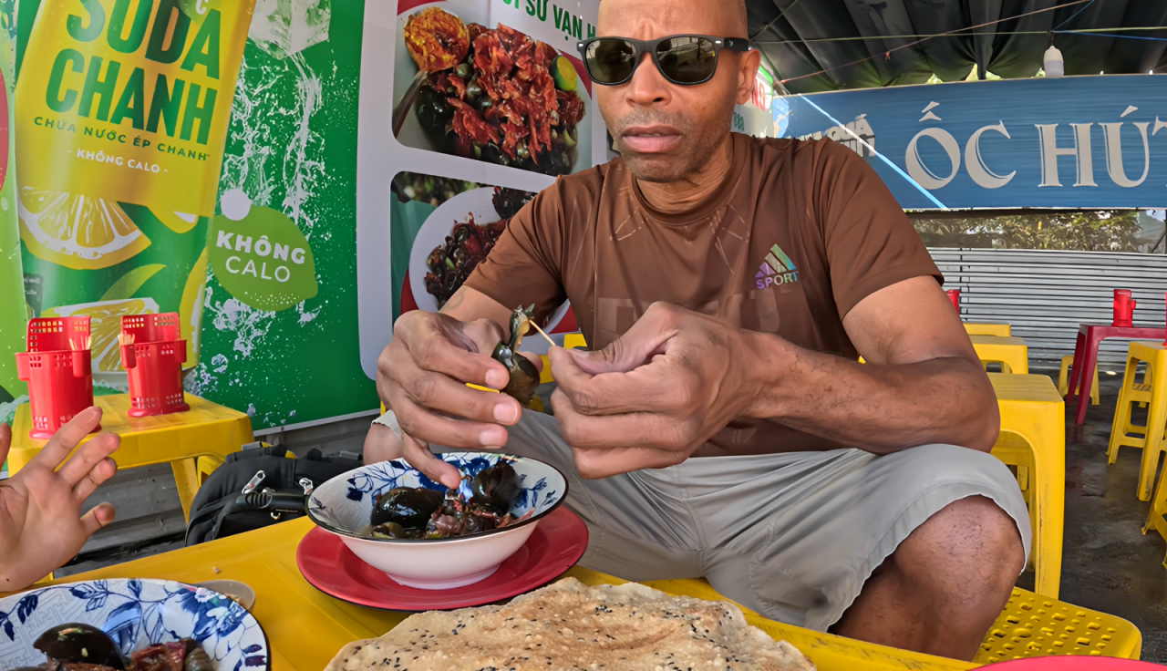 Matt thưởng thức món ốc hút vỉa hè ở Đà Nẵng