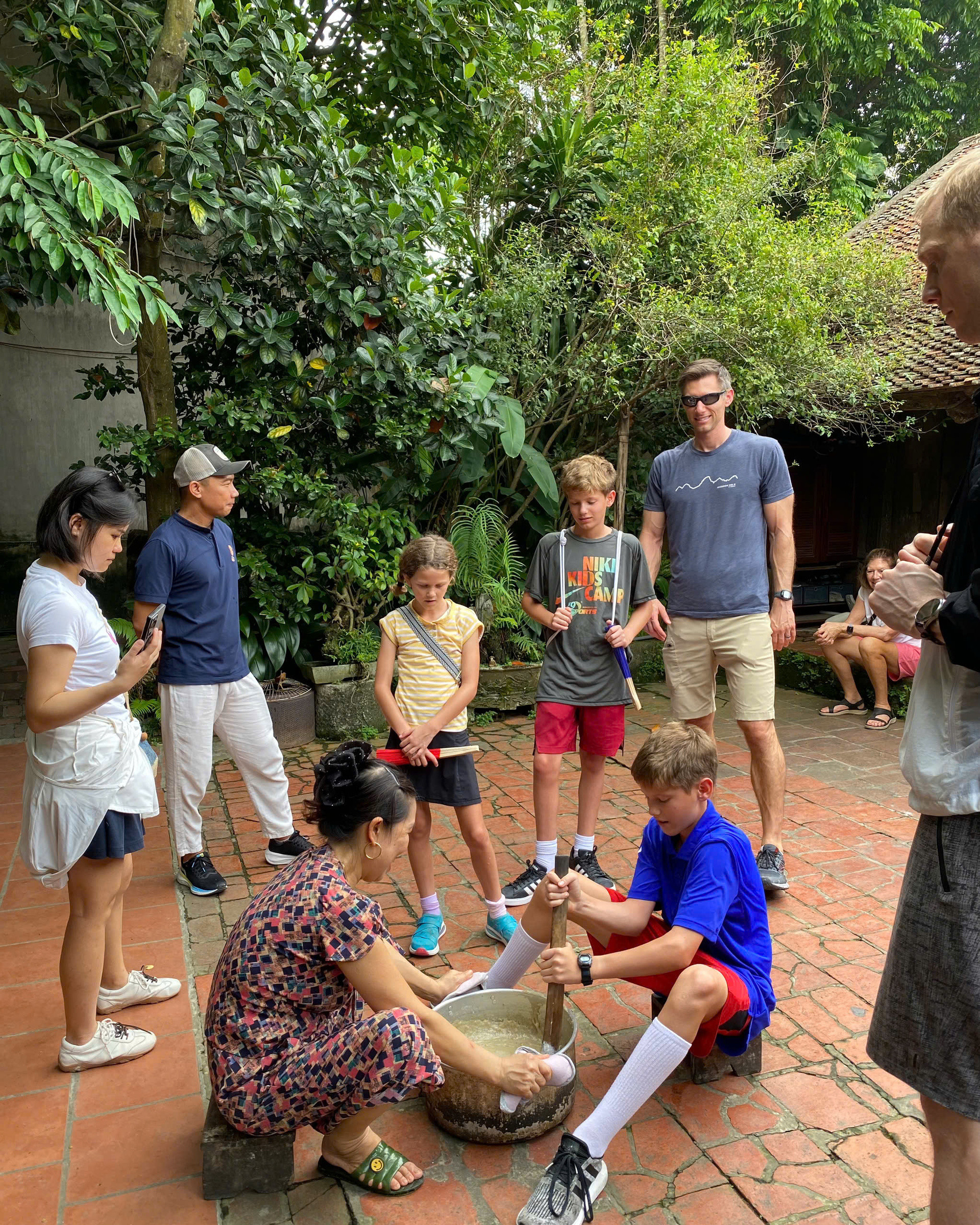 Gia đình du khách Mỹ thích thú với trải nghiệm khuấy chè lam. Ảnh: Ngọc Ánh