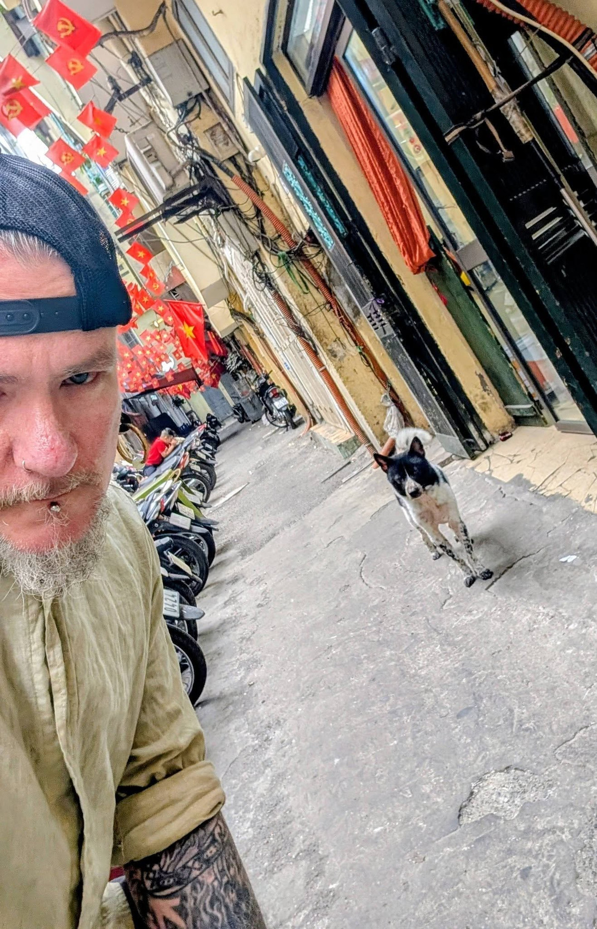 Từ những con ngõ nhỏ treo đầy cờ đỏ sao vàng ở Hà Nội cho đến vùng núi non hùng vĩ tại Ninh Bình, vị khách này luôn tìm thấy những người bạn đồng hành mới.