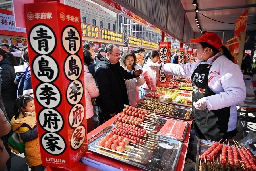 Du khách mua trái cây sấy khô tại một hội chợ ở Thanh Đảo, tỉnh Sơn Đông, Trung Quốc, ngày 17/2. Ảnh: Tân Hoa Xã.