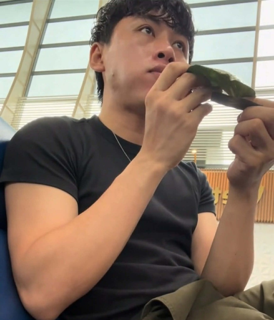 Chàng trai cố ăn hết 30 chiếc bánh bột lọc tại sân bay Tân Sơn Nhất trước khi bay sang Nhật Bản. Ảnh Báo Vietnamnet