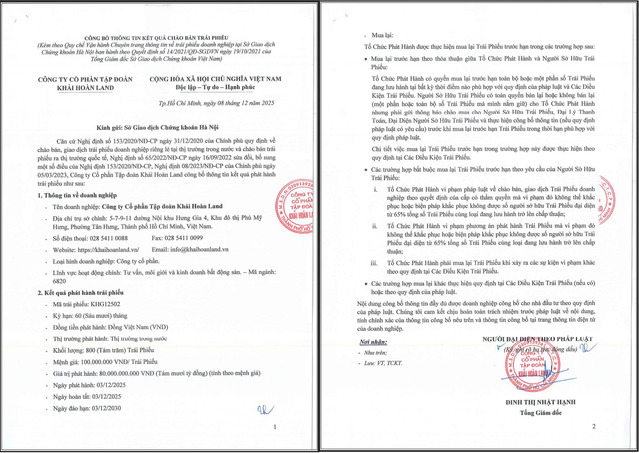Theo đó, ngày 3/12/2025, Khải Hoàn Land đã phát hành thànhcông lô trái phiếu mã KHG12502 gồm 800 trái phiếu ra thị trường trong nước.