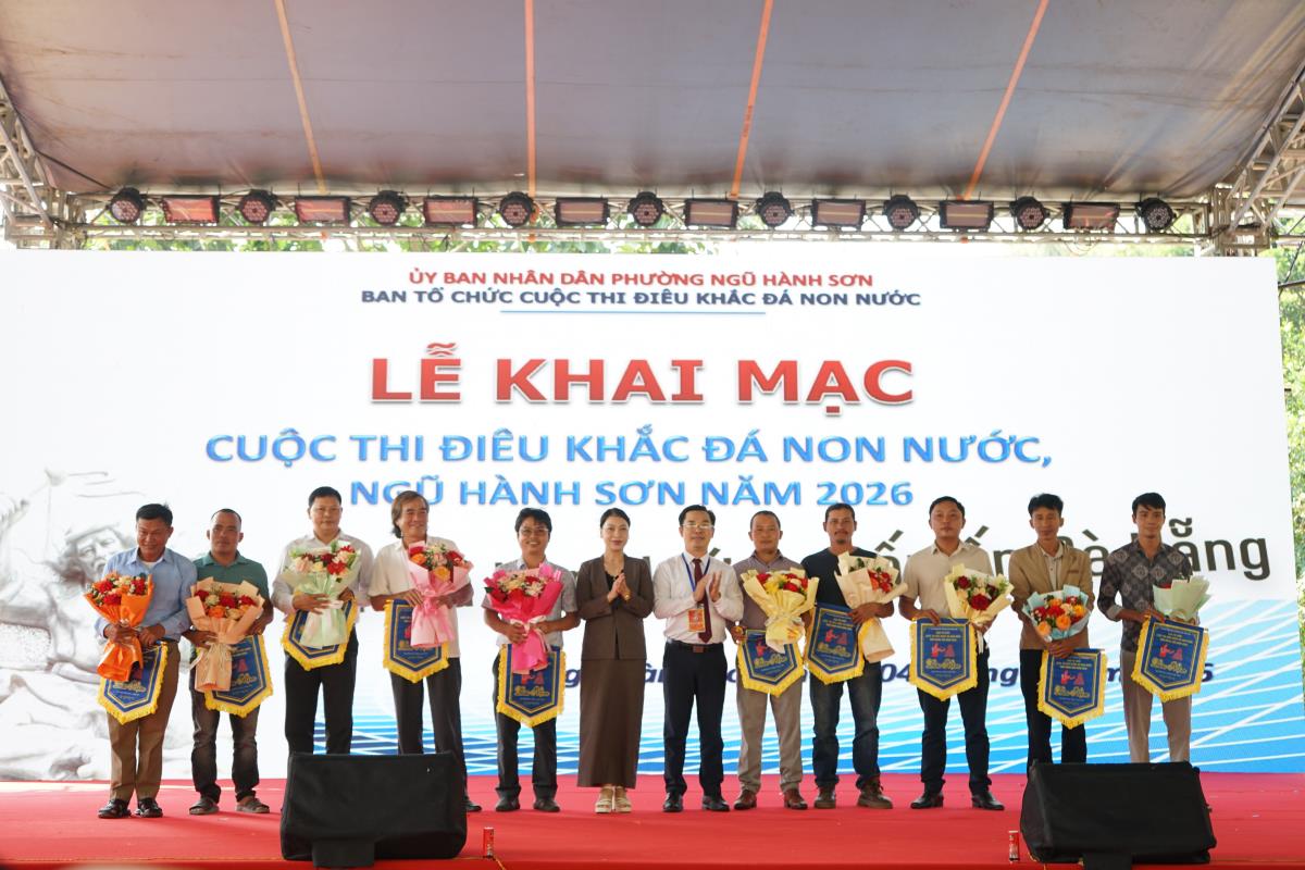 Phó Giám đốc Sở Văn hóa, Thể thao và Du lịch Nguyễn Thị Hội An cùng Phó Chủ tịch UBND phường Ngũ Hành Sơn Tạ Tự Bình tặng hoa và cơ lưu niệm cho các nhà điêu khắc, nghệ nhân tham gia cuộc thi Điêu khắc đá Non Nước năm 2026
