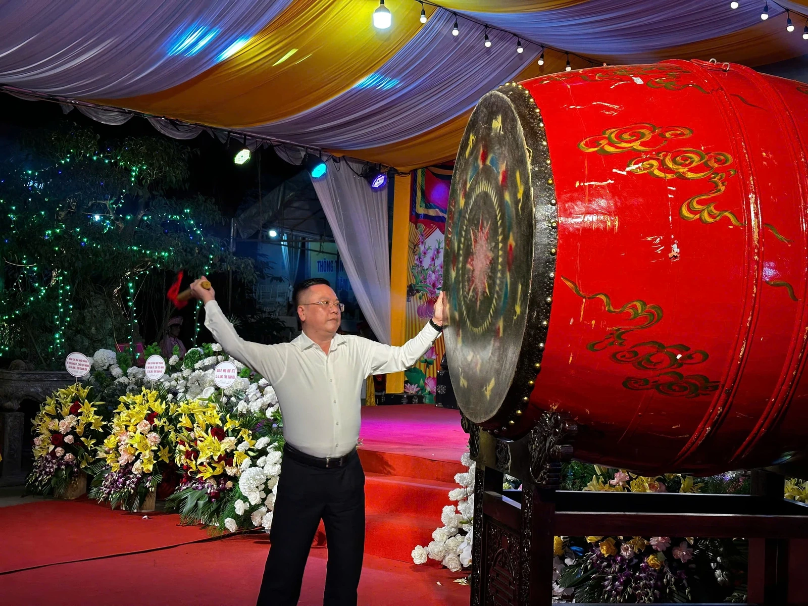 Ông Mai Nhữ Thắng - Bí Thư đảng ủy, Chủ tịch HĐND xã đánh trống khai hội