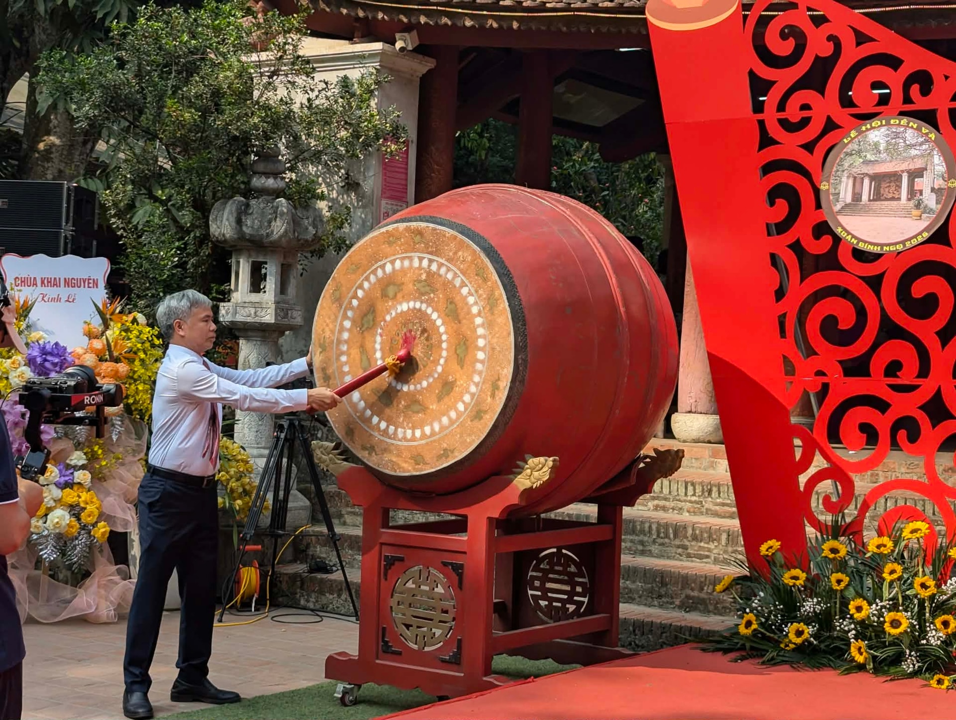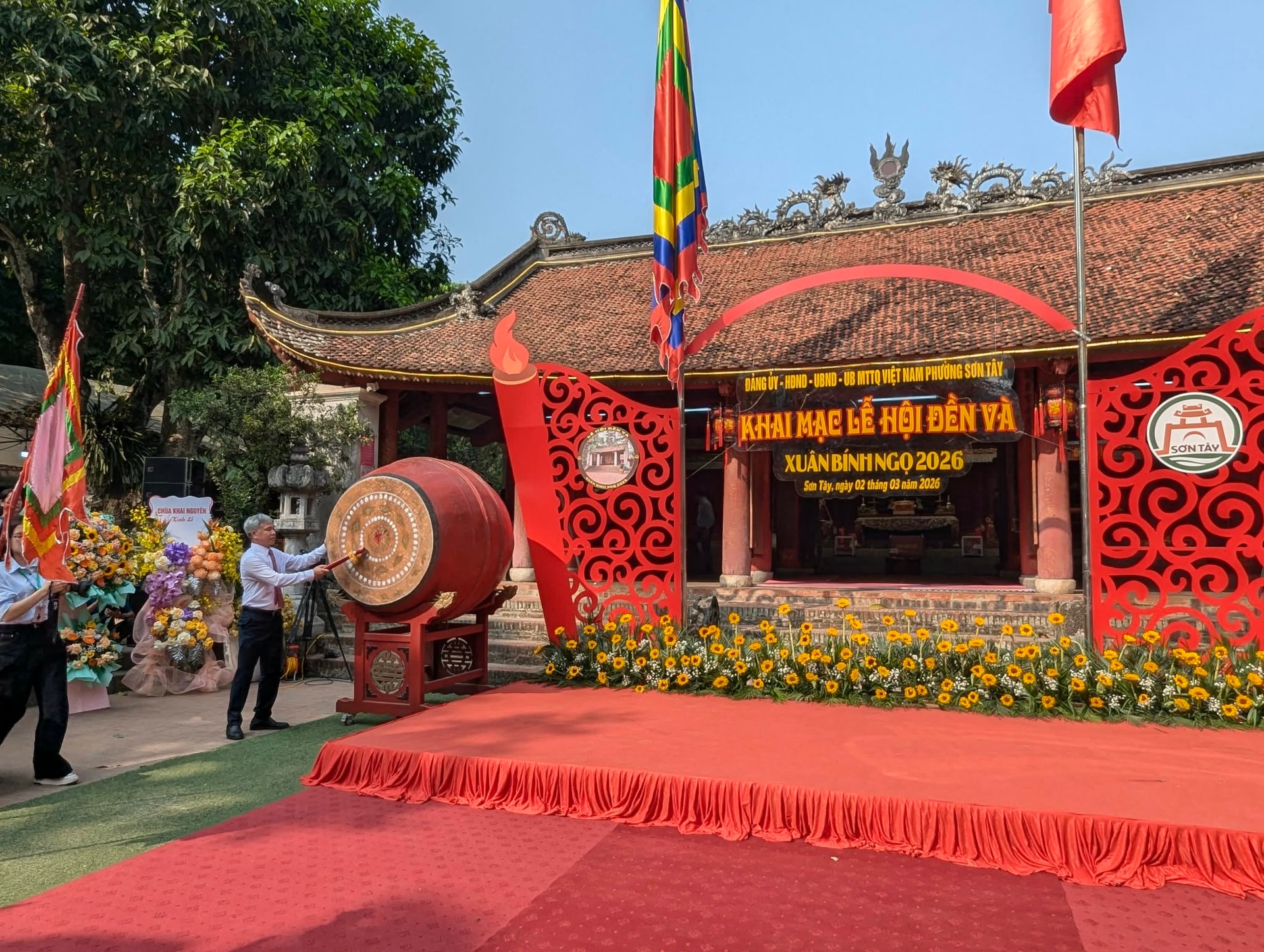 Bí thư Đảng ủy phường Sơn Tây Ngô Đình Ngũ đánh trống chính thức khai mạc Lễ hội đền Và 2026. Ảnh: Nguyễn Quý