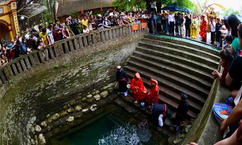 Các bô lão lấy nước giếng Ngọc đưa về đền Vua bà làm lễ. Ảnh: Thanh Lâm