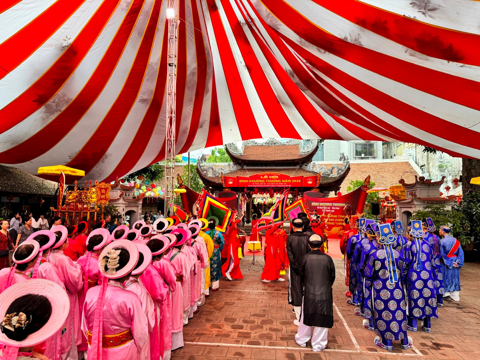 Sáng 28-3, khuôn viên đình Khương Thượng khoác lên mình diện mạo trang nghiêm, tươi mới. Cờ hội, cờ Tổ quốc rực đỏ dọc lối vào, nổi bật giữa không gian cổ kính. Những tấm pano, băng rôn được dựng từ đầu ngõ, lan tỏa không khí náo nức khắp các khu vực tại phường Kim Liên.