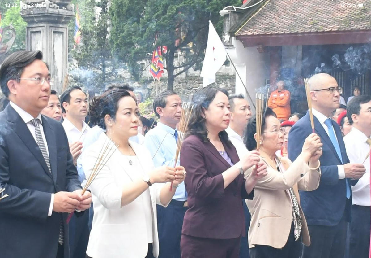 Phó Chủ tịch nước Võ Thị Ánh Xuân và các đại biểu dâng hương trước đền thờ Quốc Mẫu. Ảnh: TD.