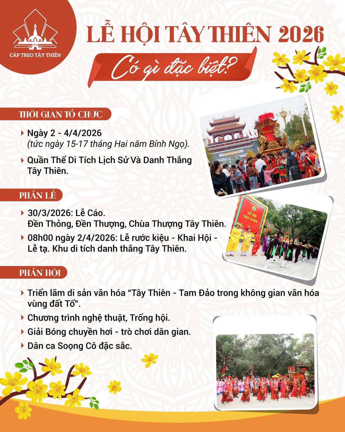 Các nghi thức truyền thống như lễ cáo, lễ rước kiệu, lễ khai mạc và nhiều hoạt động văn hóa, thể thao và du lịch phong phú, tạo không khí sôi động cho mùa lễ hội đầu Xuân. Nổi bật là giải vô địch bóng chuyền da Tây Thiên truyền thống; các hoạt động trưng bày di sản văn hóa, giới thiệu và xúc tiến các sản phẩm du lịch địa phương; chương trình nghệ thuật đặc sắc phục vụ du khách.
