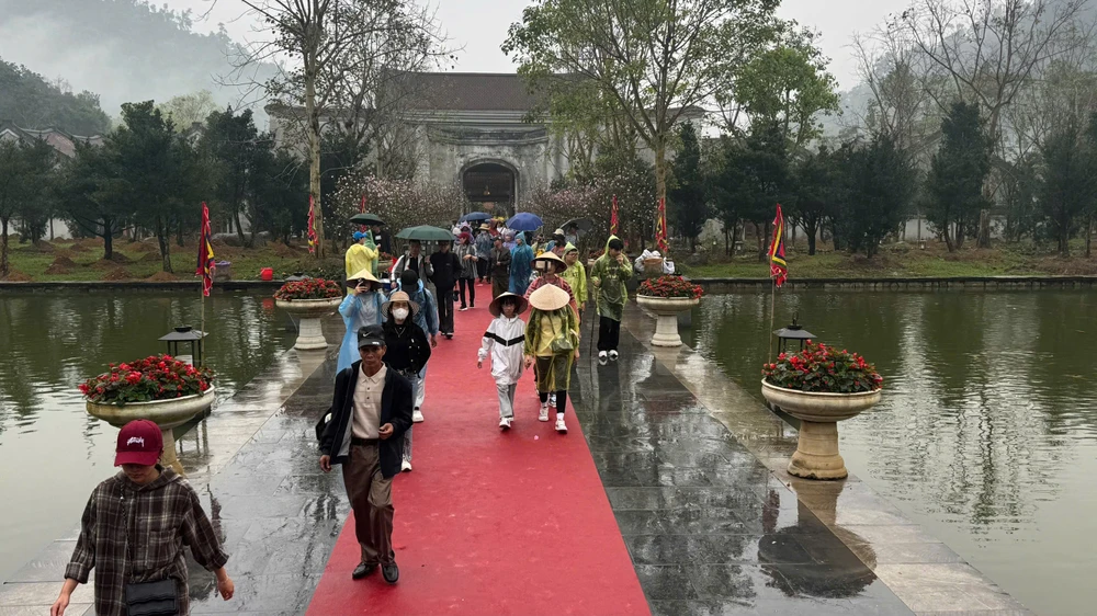Trời mưa nhẹ trong ngày khai hội nhưng vẫn có hàng nghìn tăng ni, phật tử, nhân dân và khách du lịch hành hương về Yên Tử. Ảnh: DQ