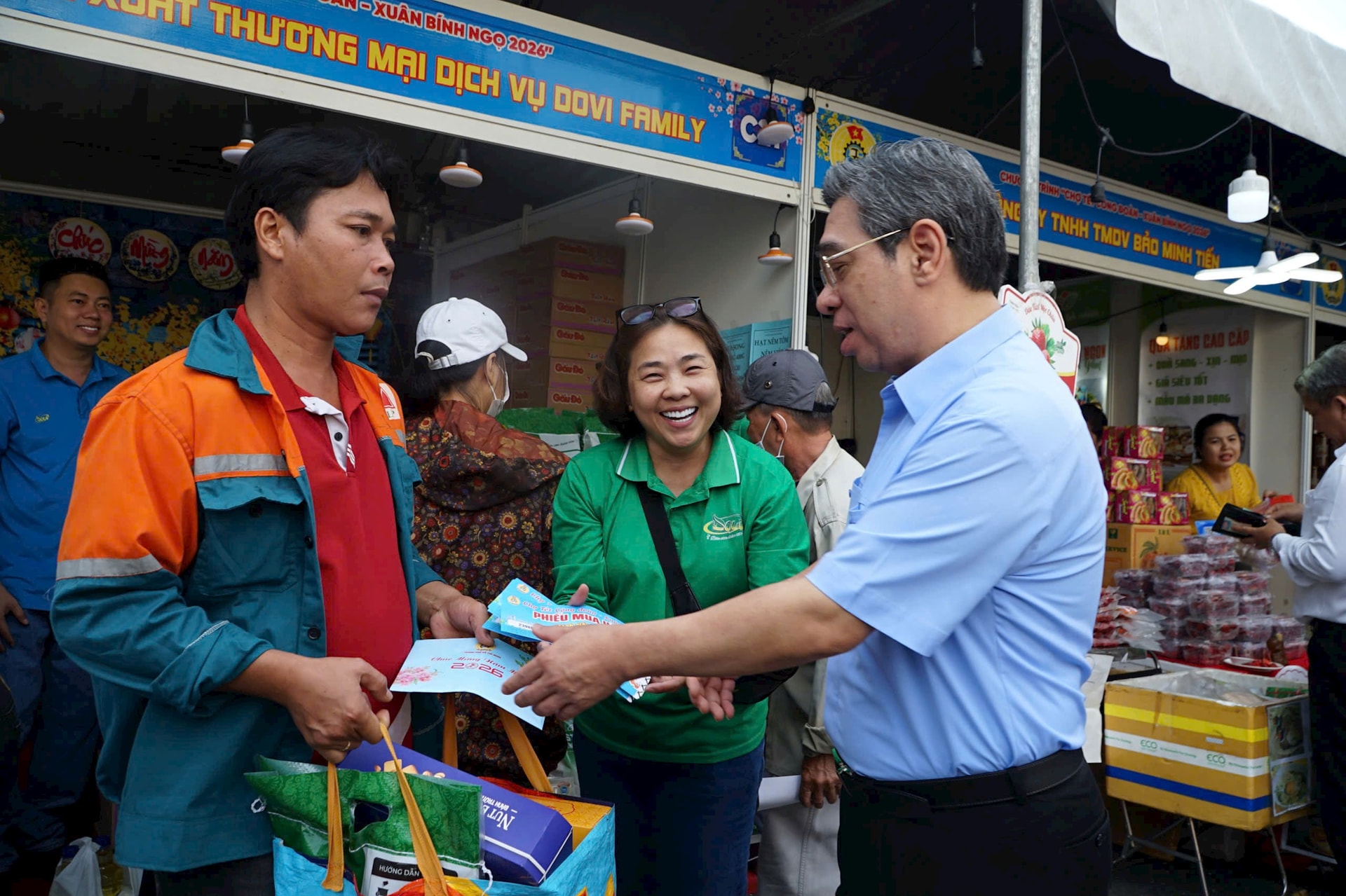 Ông Nguyễn Phước Lộc, Phó Bí thư Thành ủy, Chủ tịch Ủy ban MTTQ Việt Nam thành phố Hồ Chí Minh trò chuyện cùng đoàn viên, người lao động đi mua hàng tại Chợ Tết Công đoàn - Xuân 2026. Ảnh: Nghiêm Ý