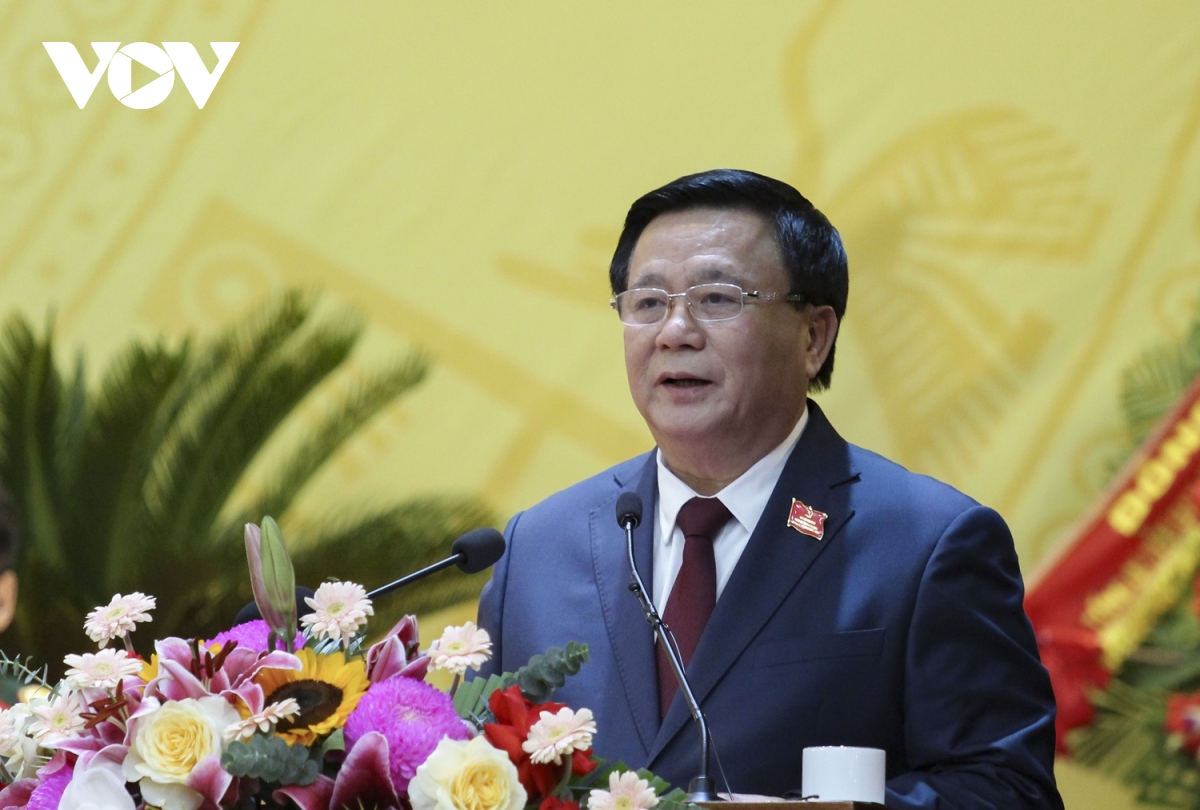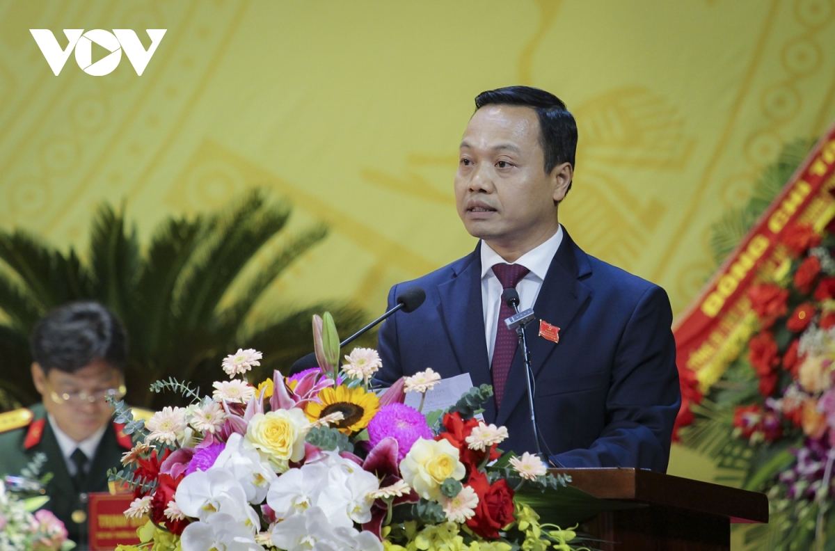 Phó Bí thư Tỉnh ủy Điện Biên Trần Tiến Dũng trình bày Báo cáo chính trị tại Đại hội Đảng bộ tỉnh Điện Biên lần thứ XV