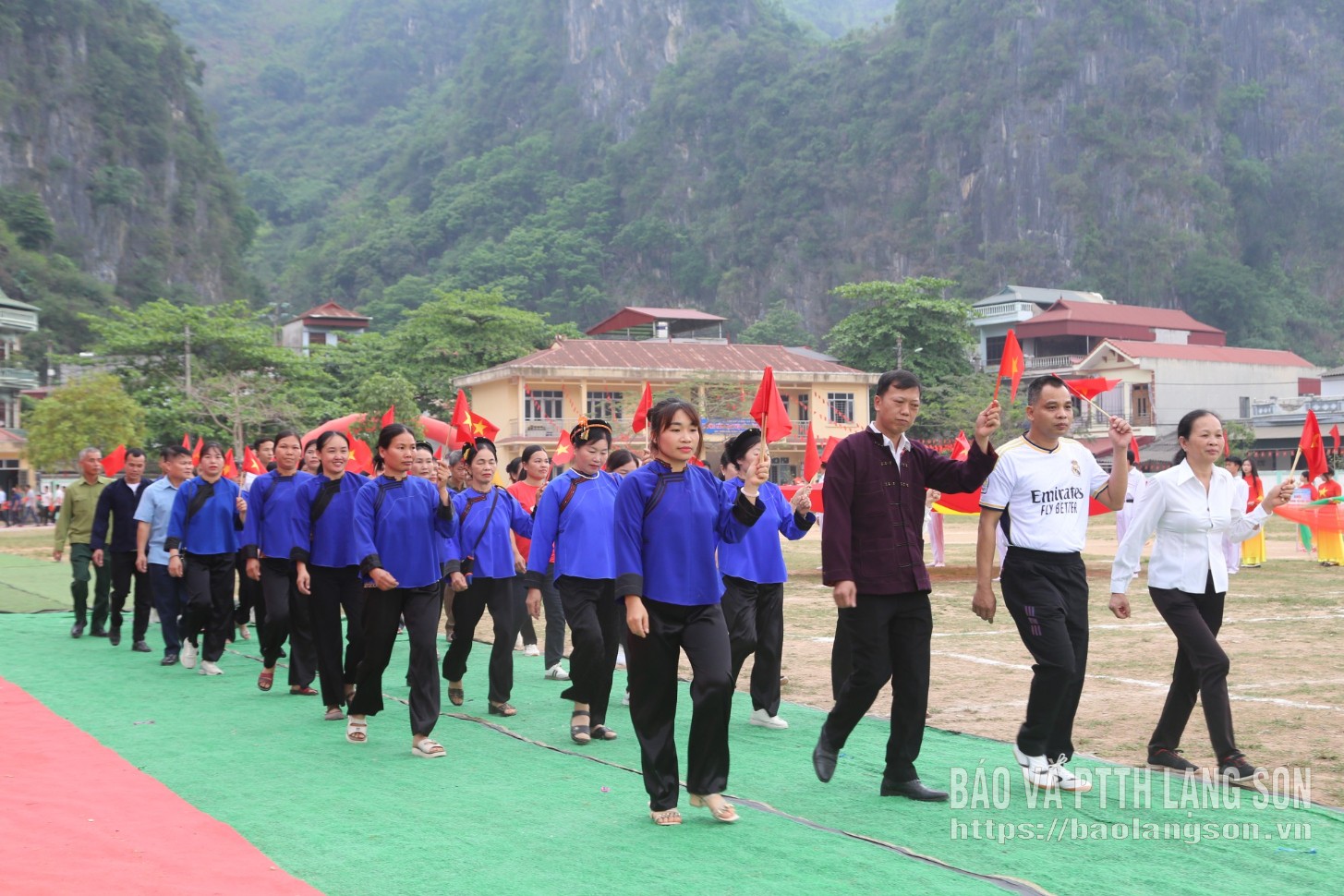 Đoàn các vận động viên đại diện cho các thôn tham dự đại hội thể dục thể thao xã Chi Lăng tham gia diễu hành tại lễ khai mạc