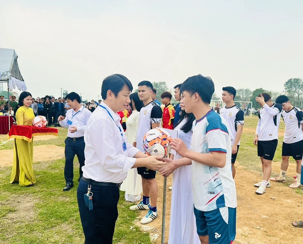 Bí thư Đảng ủy xã An Nông Nguyễn Việt Ba trao bóng cho các đội tham gia thi đấu.