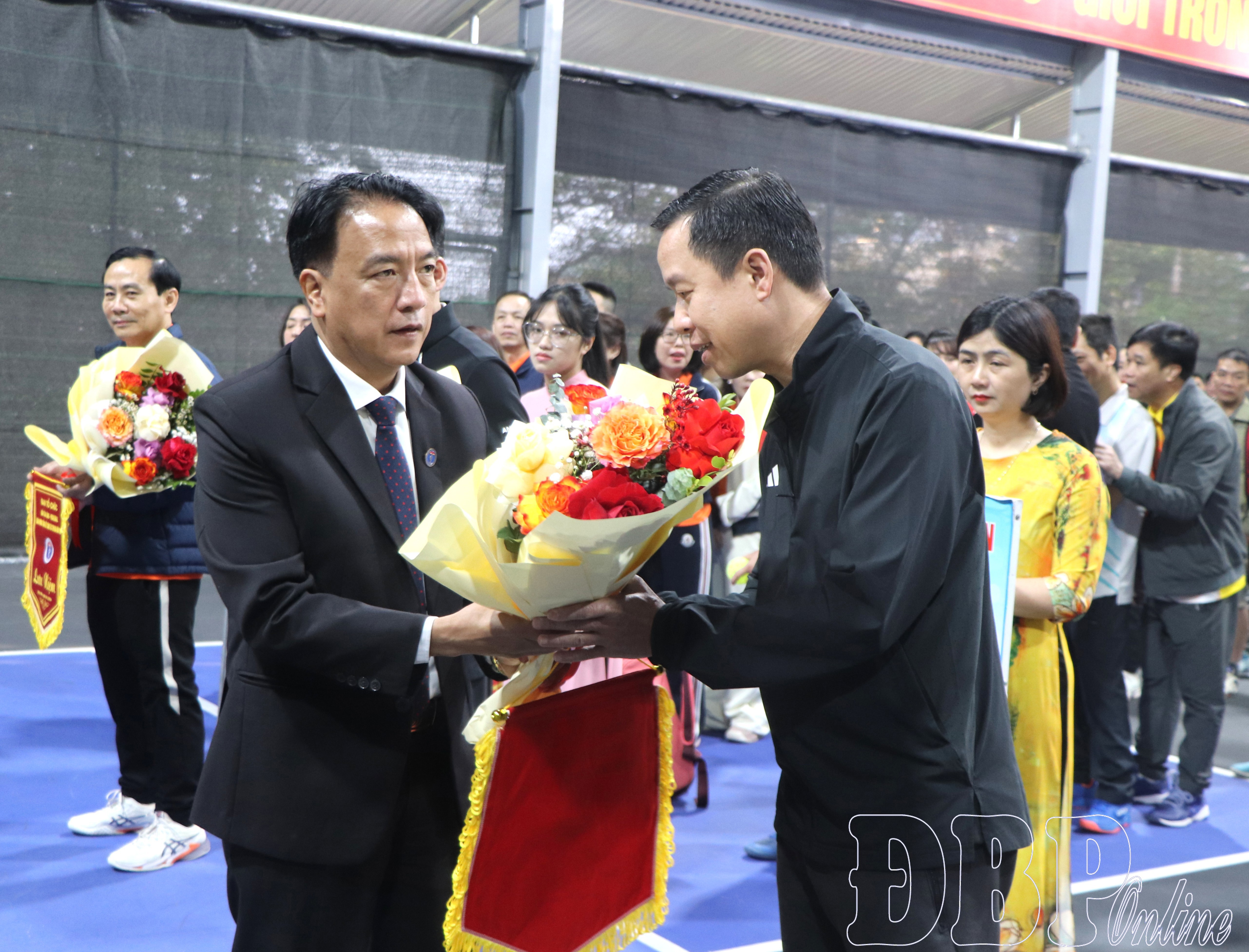 Ông Phạm Giang Nam, Giám đốc Sở Y tế Điện Biên - Cụm trưởng Cụm Thi đua số 3 tặng cờ lưu niệm cho các đoàn vận động viên.