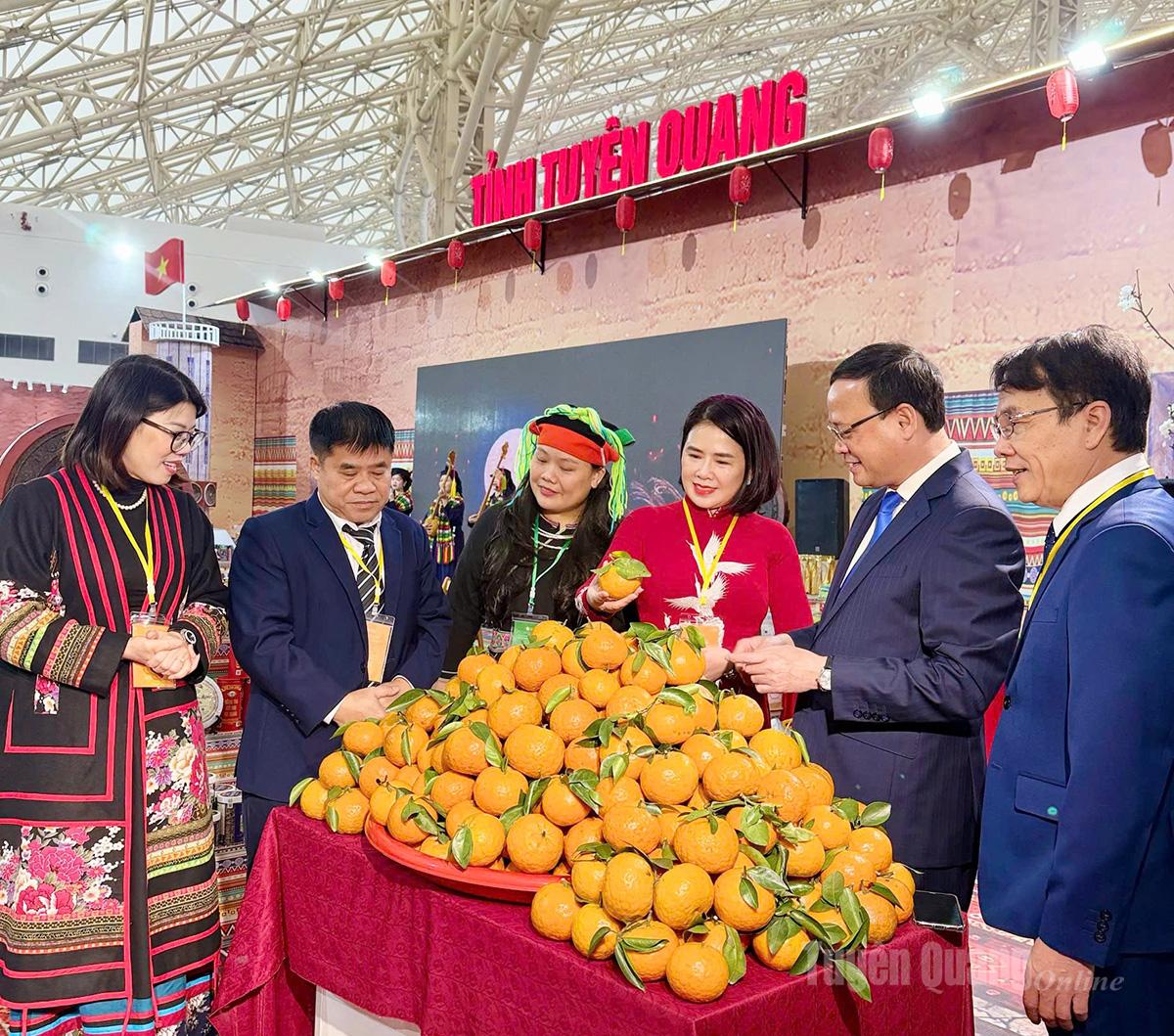 Đồng chí Nguyễn Mạnh Tuấn, Phó Chủ tịch Thường trực UBND tỉnh tham quan gian hàng trưng bày cam sành của tỉnh.