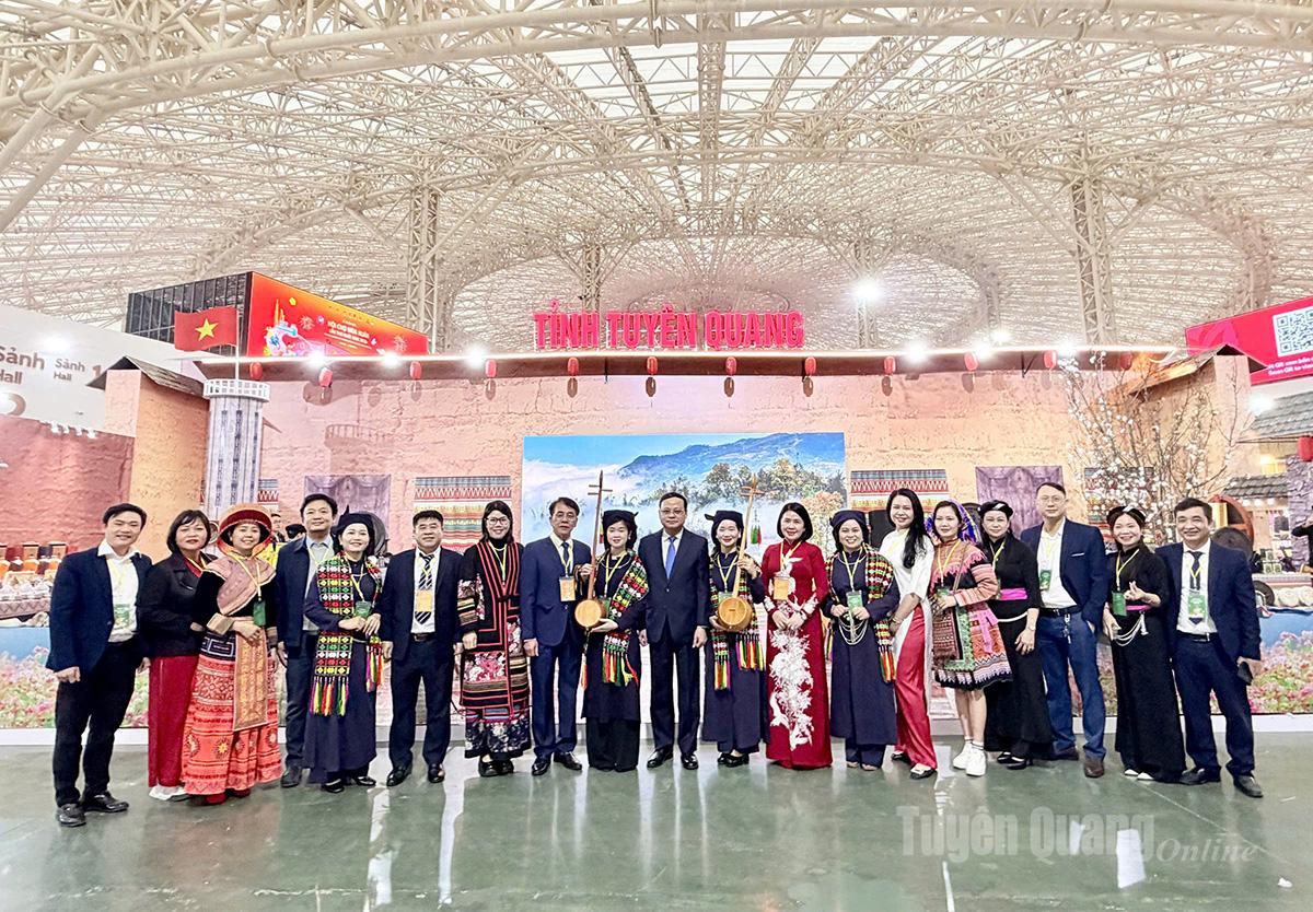 Đồng chí Nguyễn Mạnh Tuấn cùng các đại biểu chụp ảnh lưu niệm trước không gian trưng bày của tỉnh Tuyên Quang tại Hội chợ Mùa Xuân 2026.