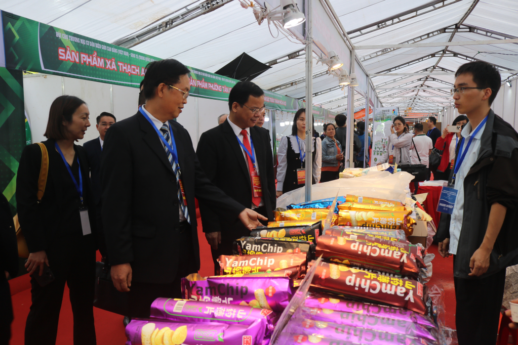 Đại biểu hai bên tham quan các gian hàng tại hội chợ.