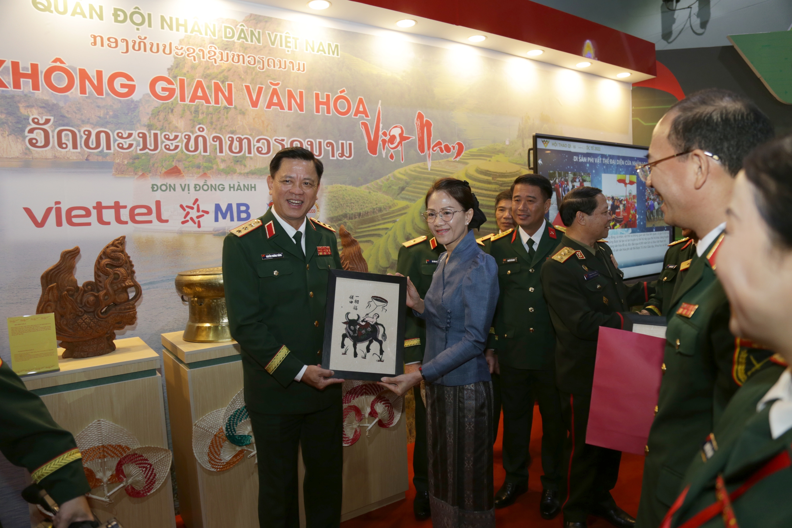 Thượng tướng Nguyễn Trường Thắng, Ủy viên Trung ương Đảng, Thứ trưởng Bộ Quốc phòng, tặng tranh Đông Hồ cho Thượng tướng Vongsone Inpanphim, Thứ trưởng Bộ Quốc phòng, Chủ nhiệm Tổng cục Chính trị Quân đội nhân dân Lào, tại Gian Không gian văn hóa Việt Nam. Ảnh: Cục Tuyên huấn