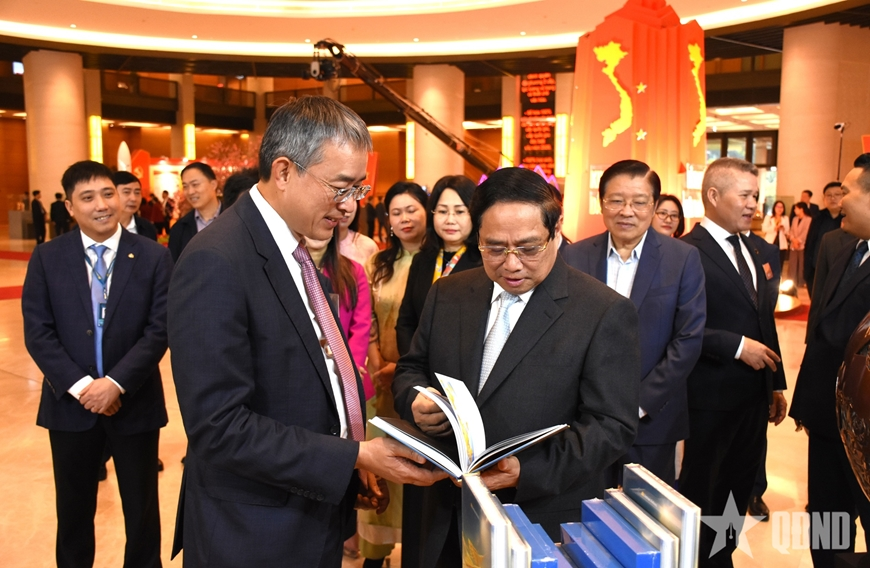 Thủ tướng Chính phủ Phạm Minh Chính cùng các đại biểu tham quan Triển lãm những thành tựu nổi bật trong phát triển kinh tế và văn hóa Việt Nam. Ảnh: TRỌNG HẢI
