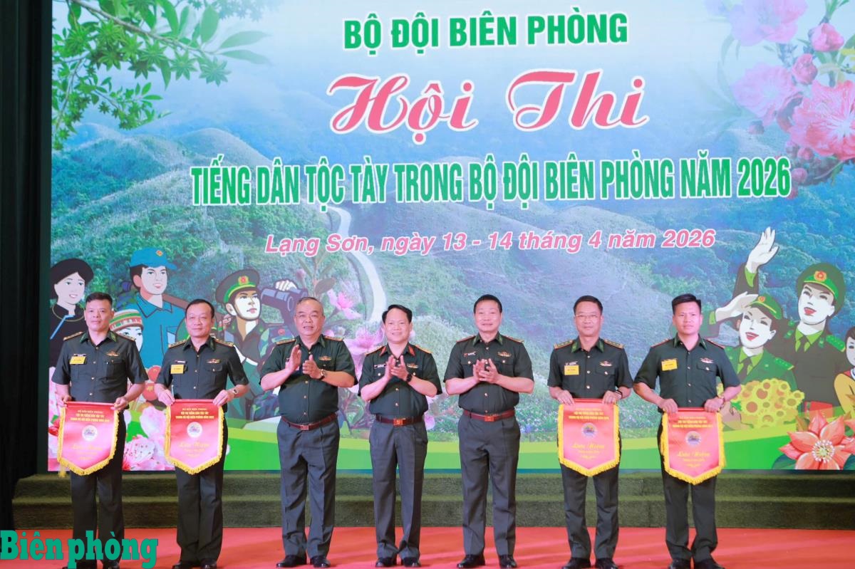 Ban Tổ chức Hội thi tiếng dân tộc Tày trong Bộ đội Biên phòng năm 2026 trao cờ lưu niệm cho các đoàn tham dự. Ảnh: Vi Toàn