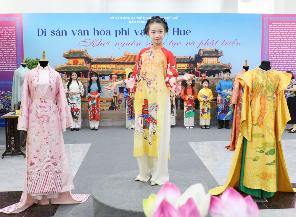 Các người mẫu "nhí" trình diễn áo dài Huế.