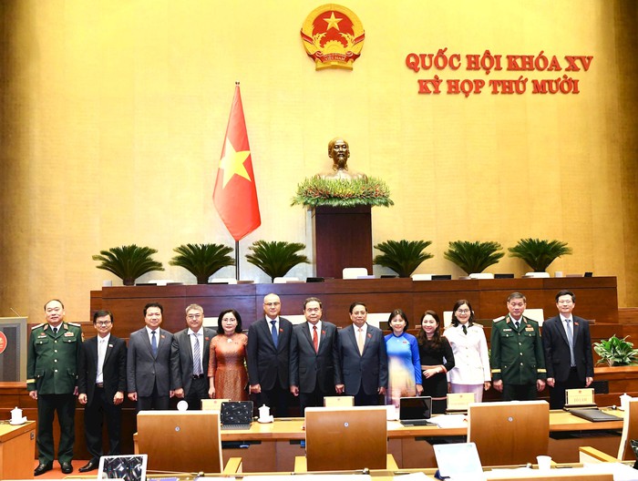 Thủ tướng Chính phủ Phạm Minh Chính, Chủ tịch Quốc hội Trần Thanh Mẫn và các Đại biểu Quốc hội chụp ảnh lưu niệm tại phiên khai mạc Kỳ họp thứ 10, Quốc hội khóa XV