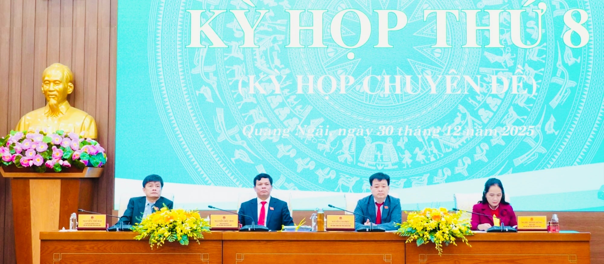 Sáng 30/12, HĐND tỉnh Quảng Ngãi khóa XIII, nhiệm kỳ 2021 - 2026 khai mạc Kỳ họp thứ 8 (kỳ họp chuyên đề) để xem xét, thảo luận và quyết định một số nội dung theo thẩm quyền. Phó Bí thư Tỉnh ủy, Chủ tịch HĐND tỉnh Nguyễn Đức Tuy; Ủy viên Ban Thường vụ Tỉnh ủy, Phó Chủ tịch Thường trực HĐND tỉnh Nguyễn Cao Phúc; Ủy viên Ban Thường vụ Tỉnh ủy, Phó Chủ tịch HĐND tỉnh Nguyễn Thế Hải và Phó Chủ tịch HĐND tỉnh Nguyễn Minh Hồng đồng chủ trì kỳ họp.