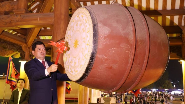 Bí thư Tỉnh ủy Bắc Ninh Nguyễn Hồng Thái đánh trống khai mạc lễ hội.