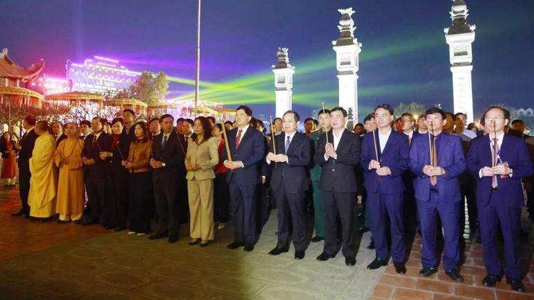 Các đại biểu dâng hương tại đêm khai hội.
