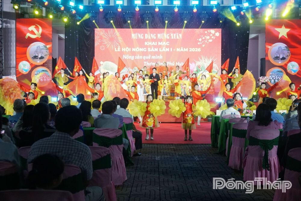 Ngay sau phần phát biểu khai mạc, các đồng chí lãnh đạo tỉnh, địa phương và đại biểu đã thực hiện nghi thức bấm nút khai mạc trong không khí trang trọng, phấn khởi, chính thức mở ra chuỗi hoạt động của Lễ hội Nông sản Phú Hựu lần thứ I, năm 2026. Tiếp đó, chương trình nghệ thuật chào mừng được dàn dựng công phu với hai chương “Phú Hựu – Sắc xuân dâng Đảng” và “Hương xuân Phú Hựu – Nông sản vươn xa”, mang đậm bản sắc văn hóa địa phương, tạo ấn tượng sâu sắc trong lòng đại biểu và Nhân dân.
