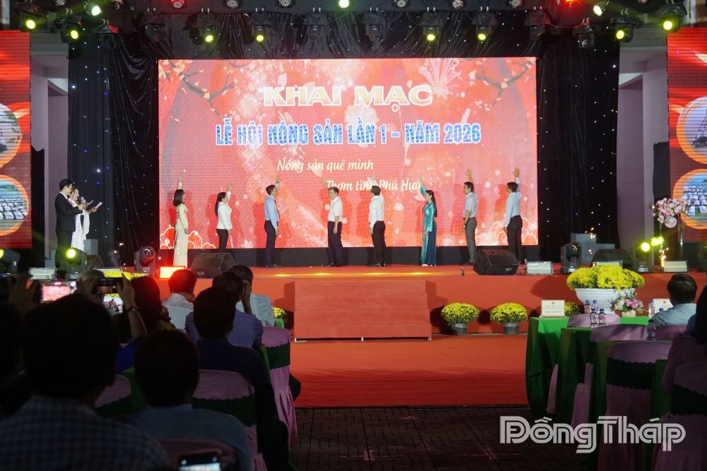 Các đại biểu thực hiện nghi thức bấm nút chính thức khai mạc Lễ hội Nông sản Phú Hựu lần thứ I, năm 2026.
