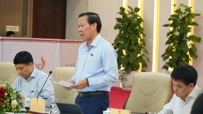 Ủy viên Trung ương Đảng, Chủ nhiệm Ủy ban Kinh tế và Tài chính Phan Văn Mãi phát biểu làm rõ thêm các nội dung cần tập trung thảo luận, cho ý kiến. (Ảnh: ANH ĐÀO)