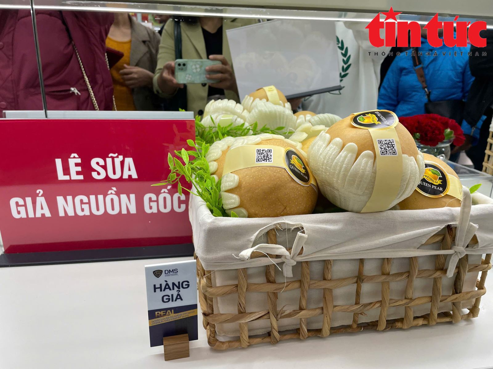 Đại diện Cục Quản lý và Phát triển thị trường trong nước hướng dẫn người dân phân biệt hàng giả, hàng thật.