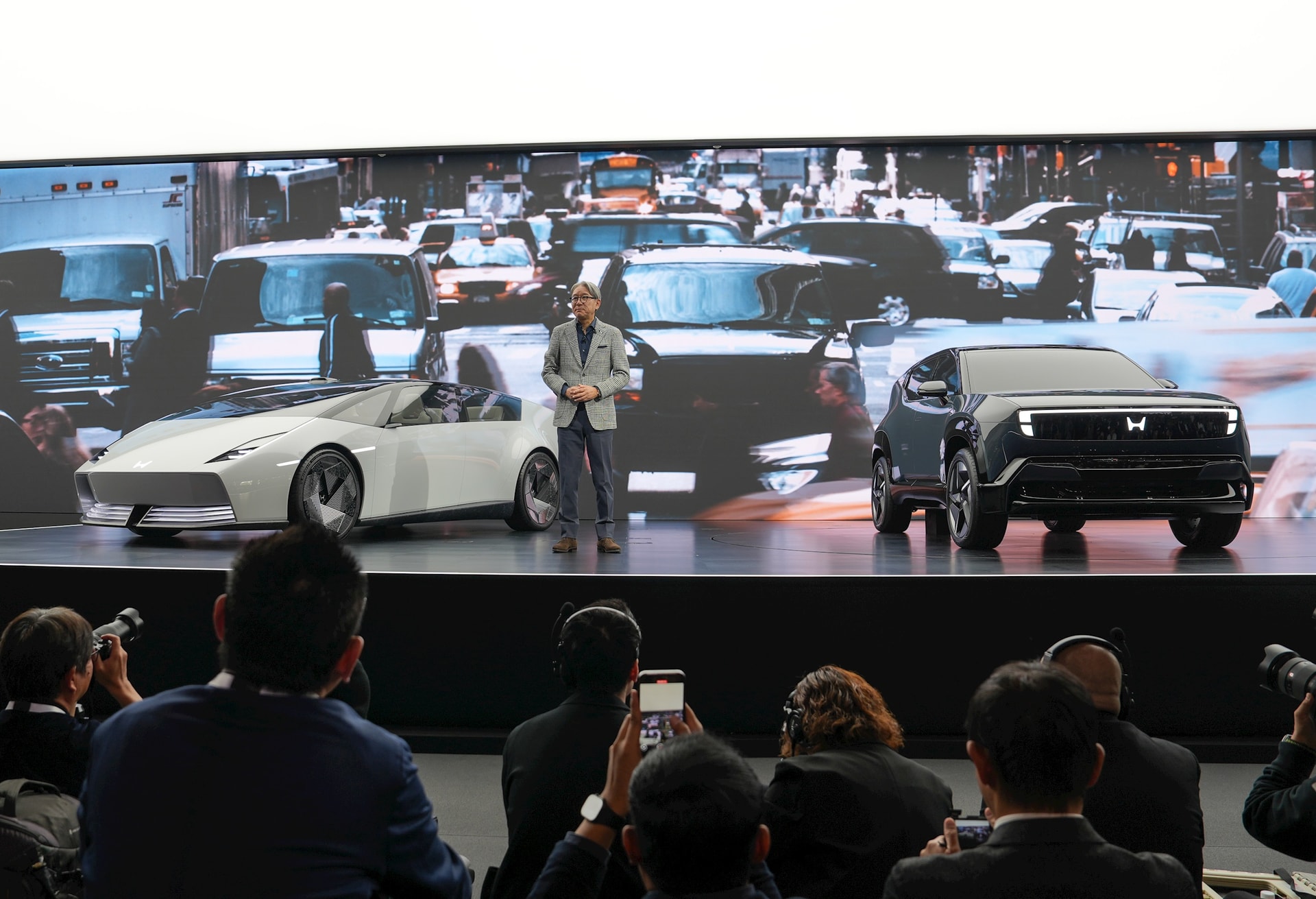 Chủ tịch, Giám đốc Điều hành Honda Motor Nhật Bản Mibe Toshihiro bên cạnh mẫu Honda 0 Alpha (bên phải) sắp có mặt ở nhiều thị trường. Ảnh: Hoàng Linh