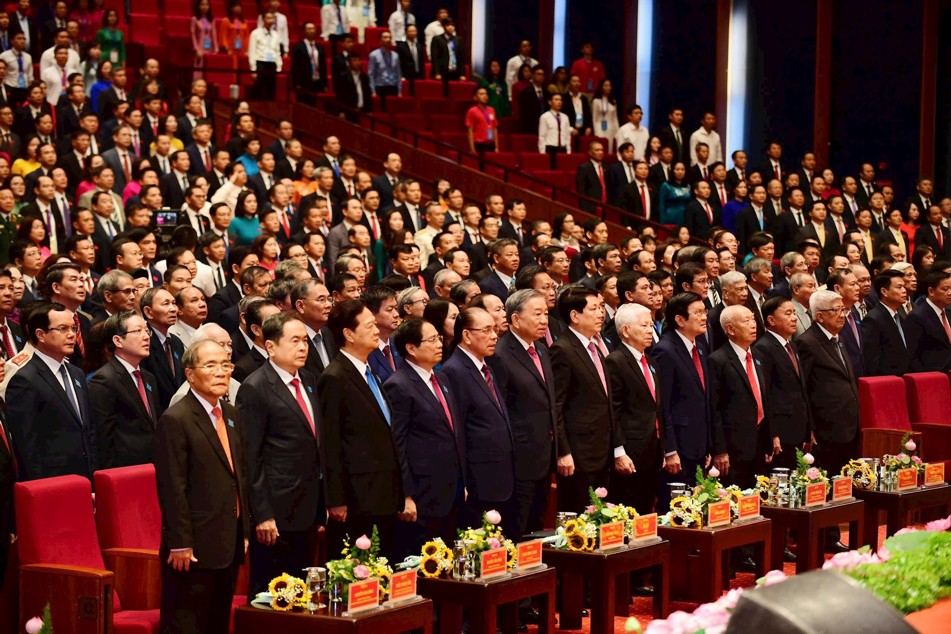 Tổng Bí thư Tô Lâm cùng các đồng chí lãnh đạo, nguyên lãnh đạo Đảng, Nhà nước dự Đại hội đại biểu Đảng bộ thành phố Hà Nội lần thứ XVIII thực hiện nghi lễ Chào cờ. Ảnh: PV