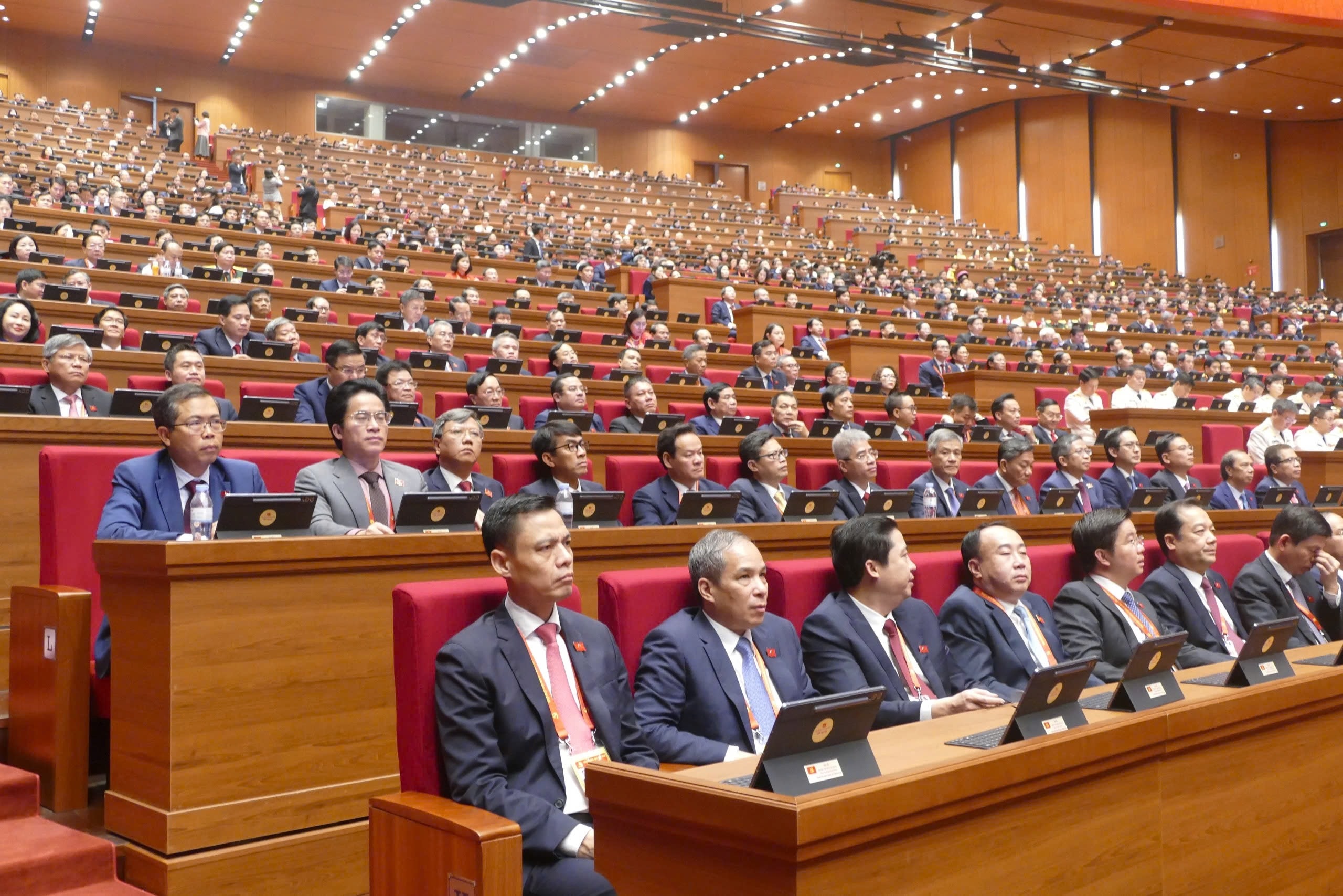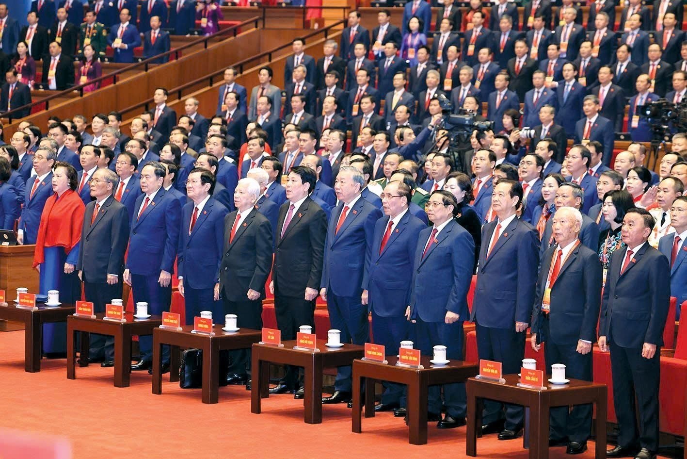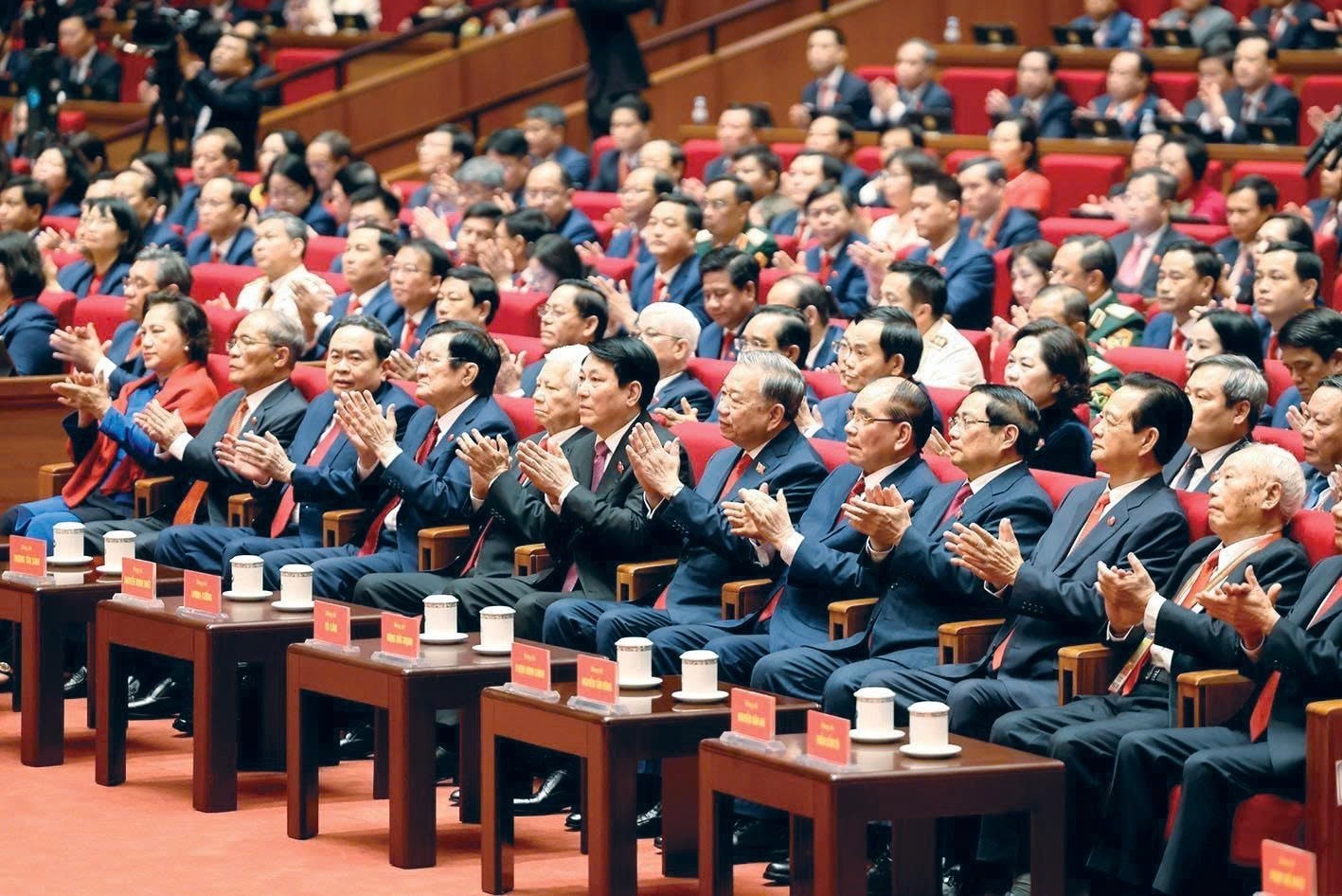 Tổng Bí thư Tô Lâm và các Ủy viên Bộ Chính trị: Chủ tịch nước Lương Cường, Thủ tướng Chính phủ Phạm Minh Chính, Chủ tịch Quốc hội Trần Thanh Mẫn, Thường trực Ban Bí thư Trần Cẩm Tú, các Ủy viên Bộ Chính trị, Ủy viên Ban Bí thư, Ủy viên Trung ương Đảng cùng các đại biểu đại diện cho hơn 5,6 triệu đảng viên trong cả nước tham dự Đại hội.