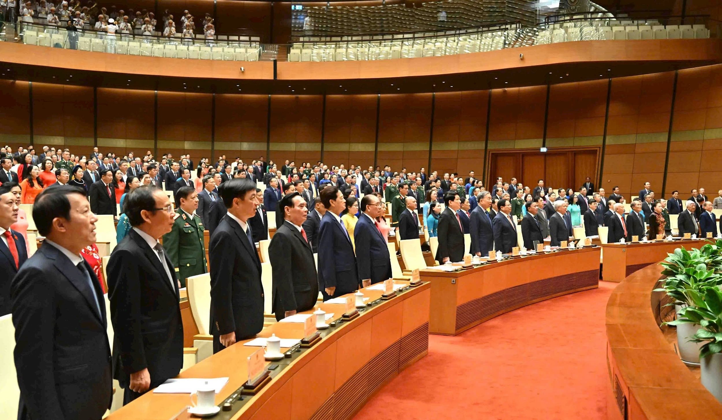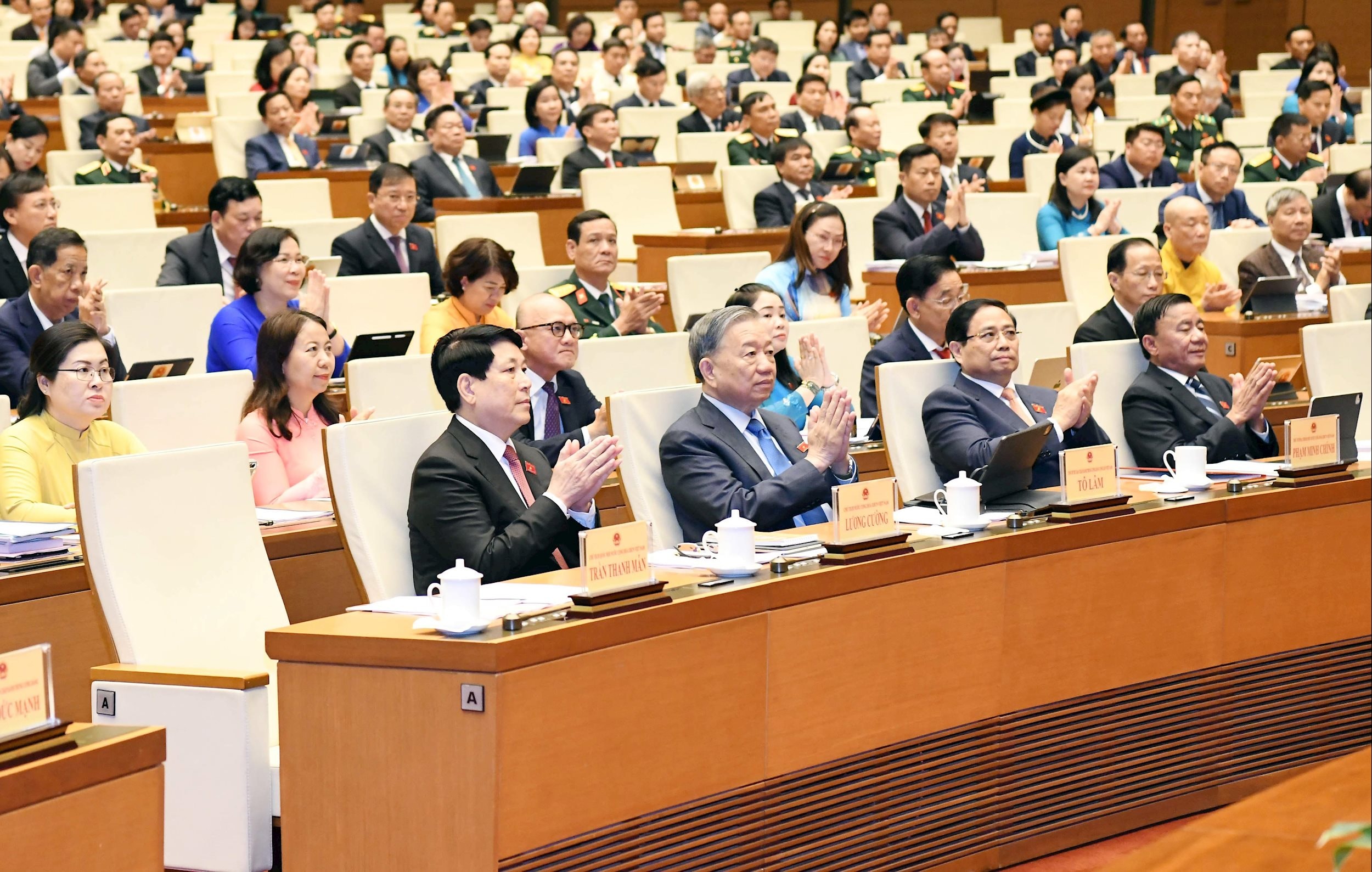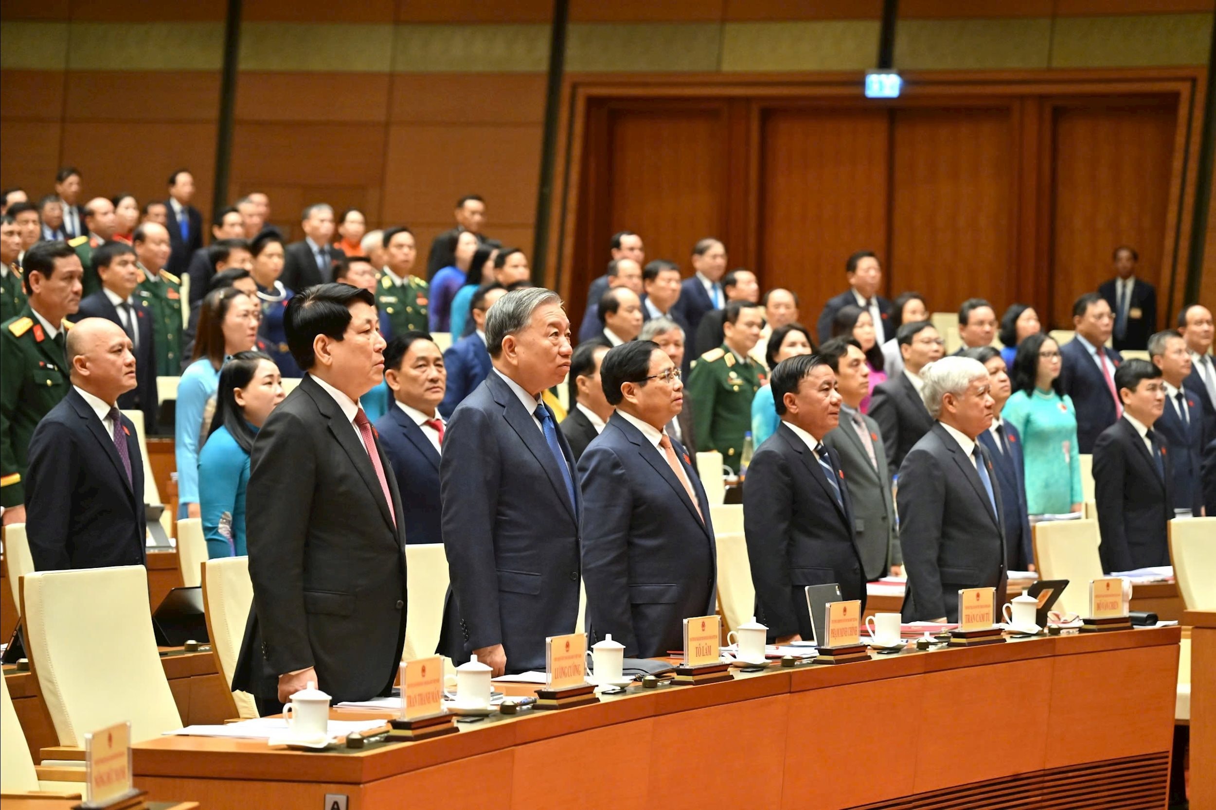 Tổng Bí thư Tô Lâm, Chủ tịch nước Lương Cường, Thủ tướng Phạm Minh Chính, Thường trực Ban Bí thư Trần Cẩm Tú và các đại biểu Quốc hội dự Kỳ họp thứ Mười. Ảnh: Lâm Hiển