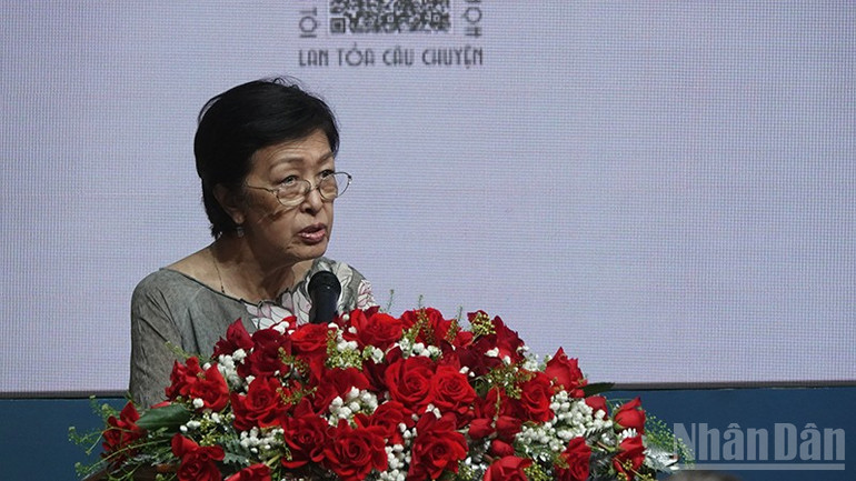 Bà Tôn Nữ Thị Ninh, Chủ tịch Quỹ Hòa bình và Phát triển Thành phố Hồ Chí Minh phát biểu tại lễ khai mạc.