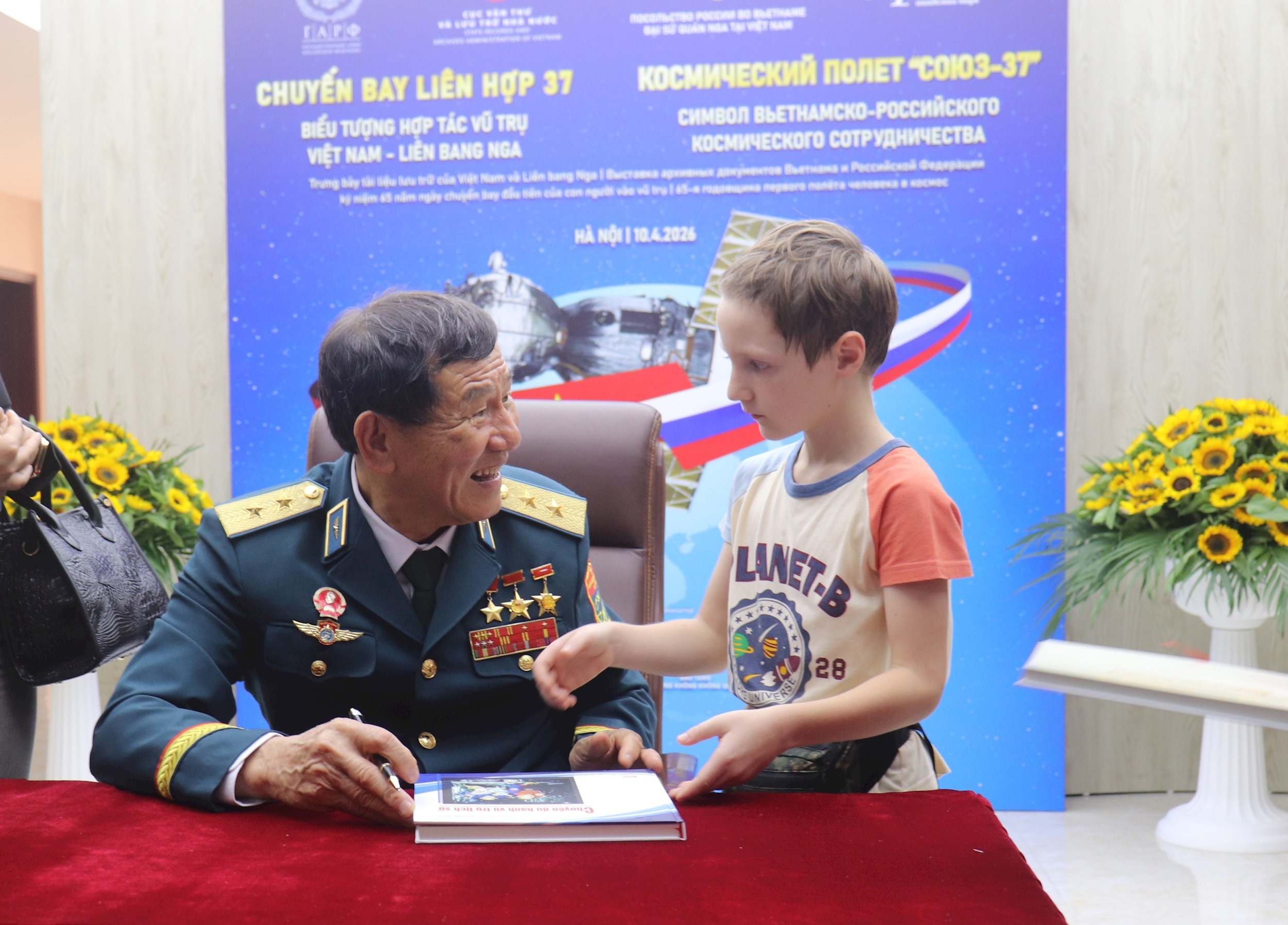 Trung tướng, Anh hùng Lực lượng vũ trang nhân dân Phạm Tuân ký tặng sách "Chuyến du hành vũ trụ lịch sử" cho độc giả nhỏ tuổi người nước ngoài. Ảnh: Hiền Chi
