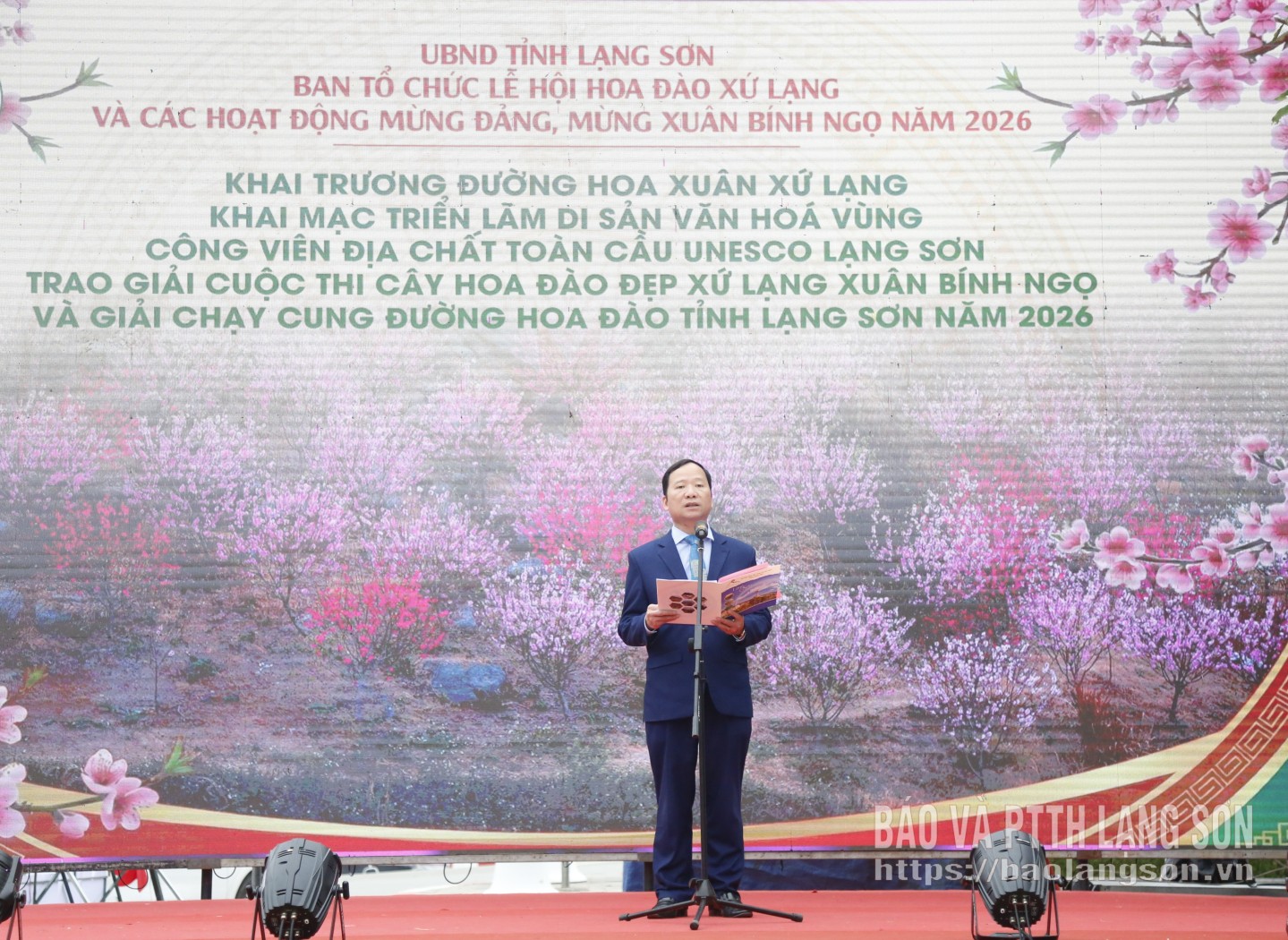 Giám đốc Sở Văn hóa, Thể thao và Du lịch, Phó Trưởng ban Thường trực Ban Tổ chức Lễ hội Hoa Đào xứ Lạng và các hoạt động mừng Đảng, mừng Xuân Bính Ngọ năm 2026 phát biểu khai mạc chương trình