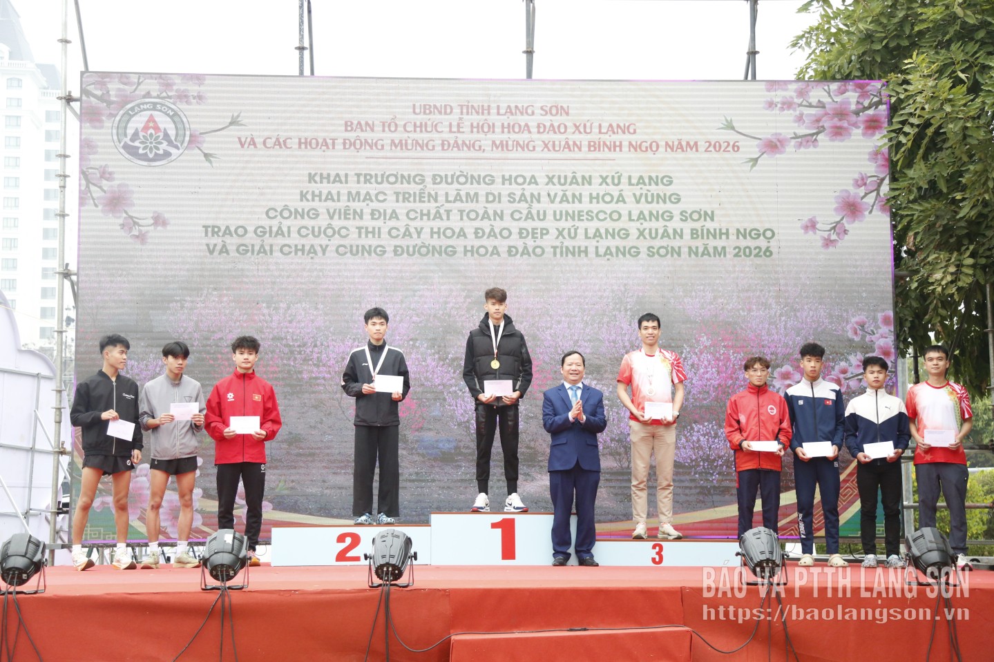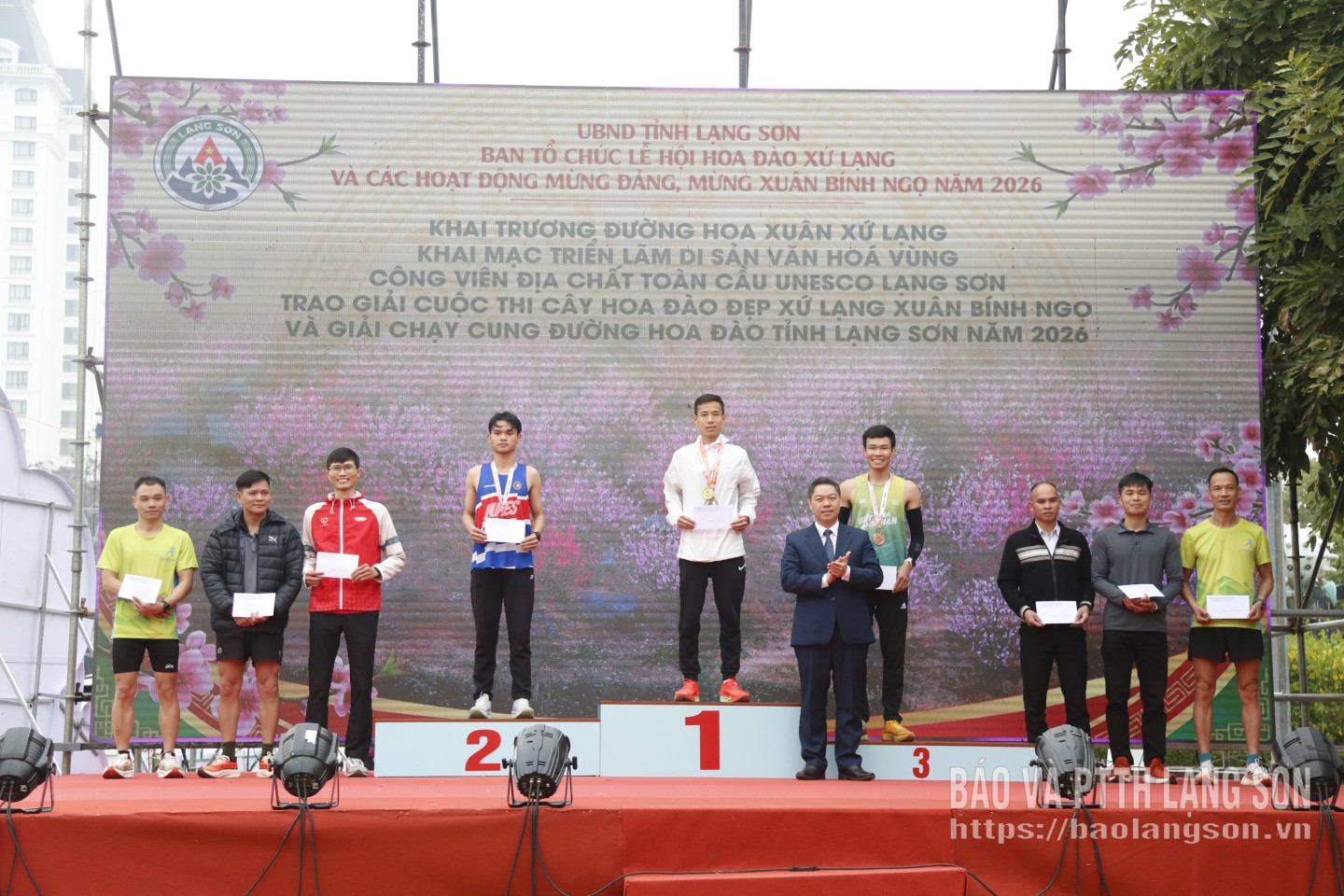 Giám đốc Sở Văn hóa, Thể thao và Du lịch, Phó Trưởng ban Thường trực Ban Tổ chức Lễ hội Hoa Đào xứ Lạng và các hoạt động mừng Đảng, mừng Xuân Bính Ngọ năm 2026 trao giải cho các vận động viên xuất sắc nhất cự li 6,5 km nam