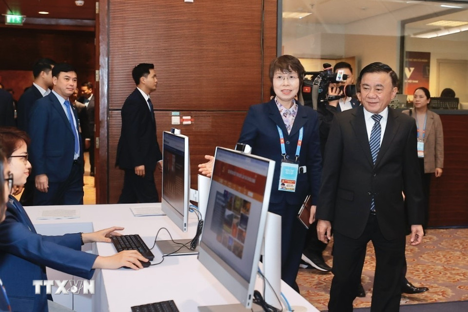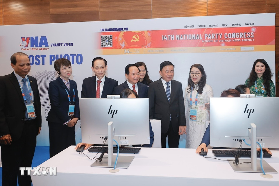 Đại biểu tham quan khu vực tác nghiệp của TTXVN tại Trung tâm Báo chí. (Ảnh: Minh Quyết/TTXVN)