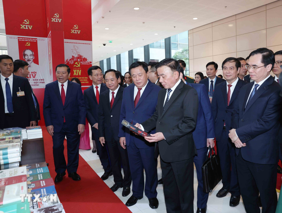 Thường trực Ban Bí thư Trần Cẩm Tú cùng các đại biểu tham quan Khu trưng bày sách, báo phục vụ Đại hội. (Ảnh: Phương Hoa/TTXVN)