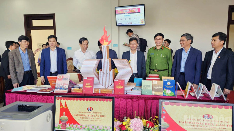 Lãnh đạo tỉnh Lâm Đồng tham quan khu vực trưng bày tài liệu Đảng bộ tỉnh Lâm Đồng và không gian tác nghiệp tại Trung tâm báo chí phục vụ Đại hội đại biểu Đảng bộ tỉnh lần thứ I.