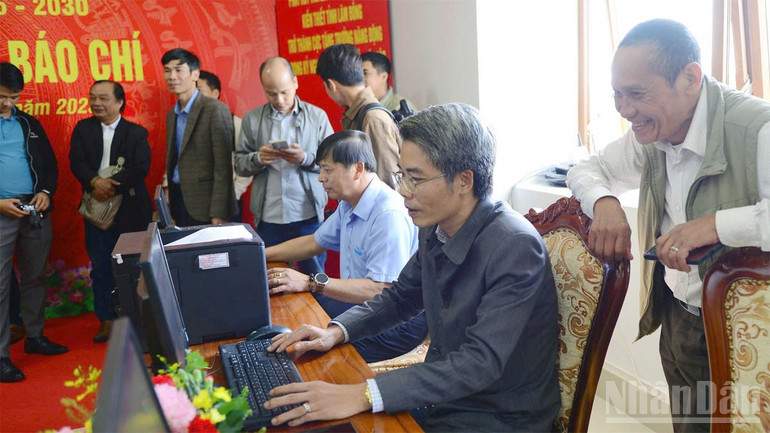 Các nhà báo thực tế tại Trung tâm báo chí phục vụ Đại hội đại biểu Đảng bộ tỉnh Lâm Đồng lần thứ I.