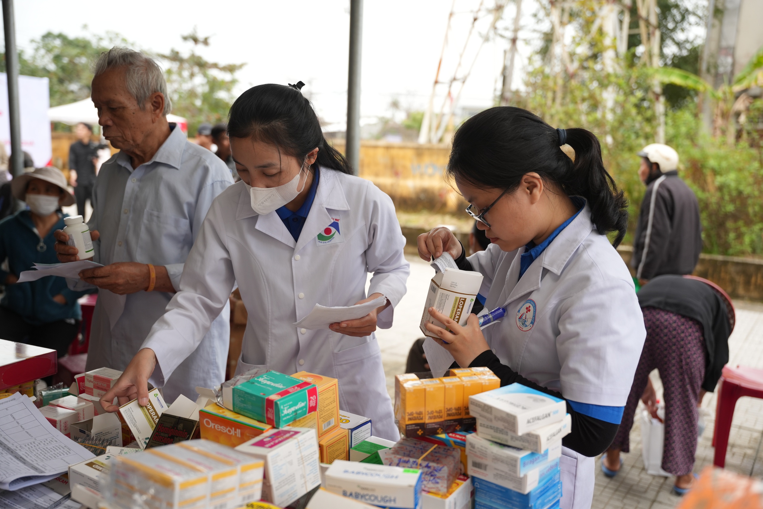 Nhân viên y tế cấp phát thuốc miễn phí cho người dân tại chương trình.