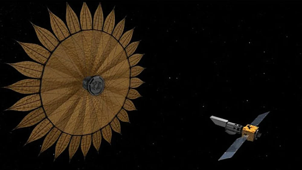 Ảnh minh họa thiết kế Đài quan sát Thế giới có thể sống được với tấm chắn sao; trong thực tế, kính có thể dùng vành nhật hoa hoặc tấm chắn, cả hai đều giúp chặn ánh sáng từ ngôi sao. (Nguồn: NASA)